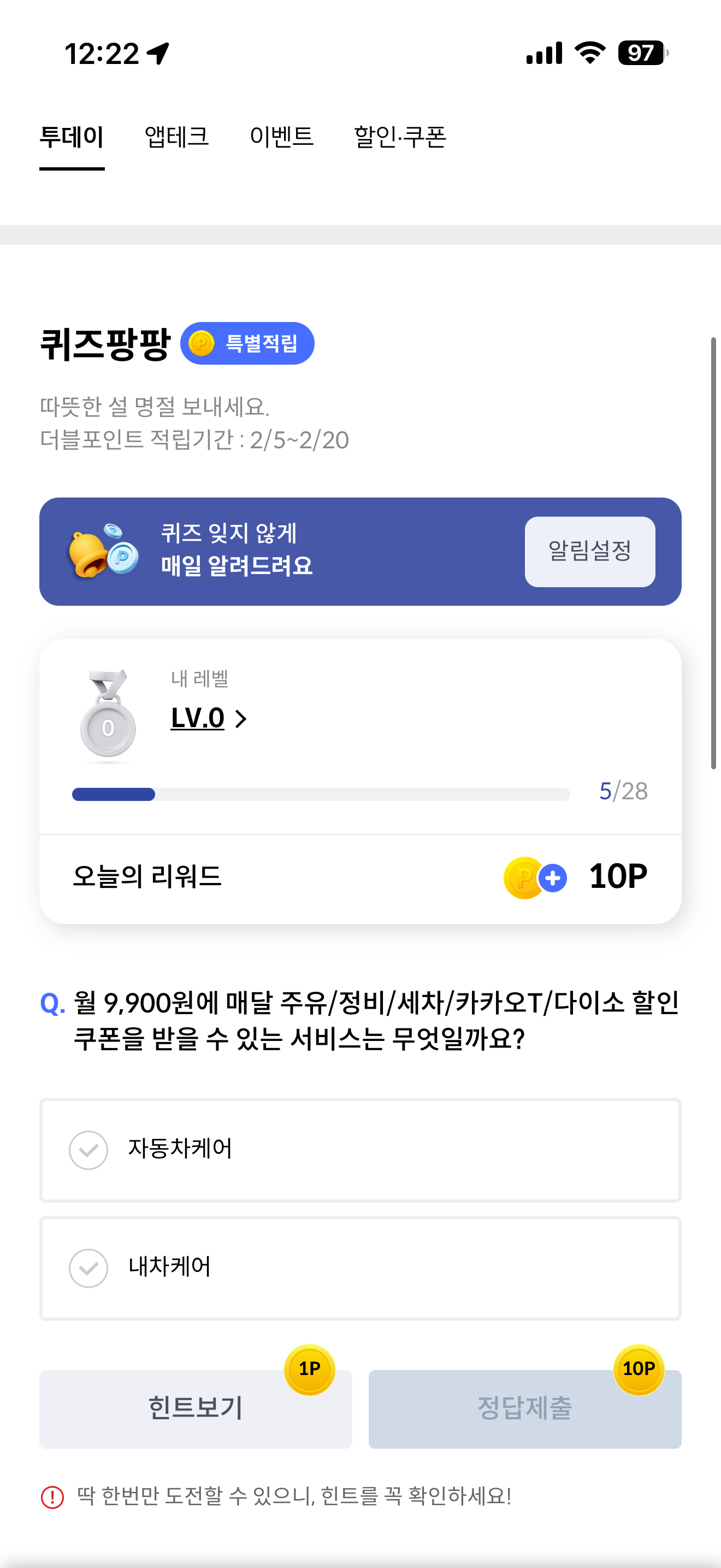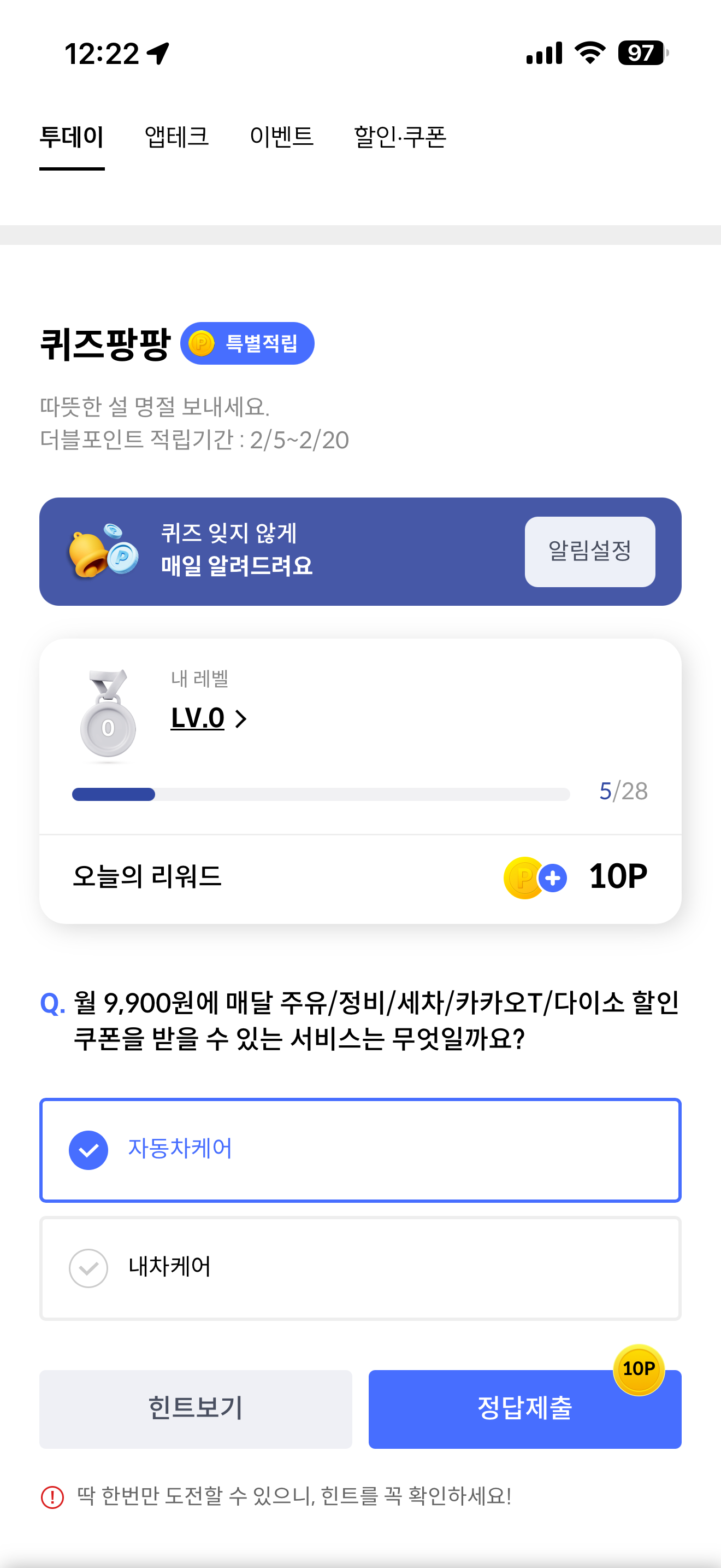 월 9,900원에 매달 주유/정비/세차/카카오T/다이소 할인 쿠폰을 받을 수 있는 서비스는 무엇일까요? 보기는 1. 자동차케어 2. 내차케어 입니다.