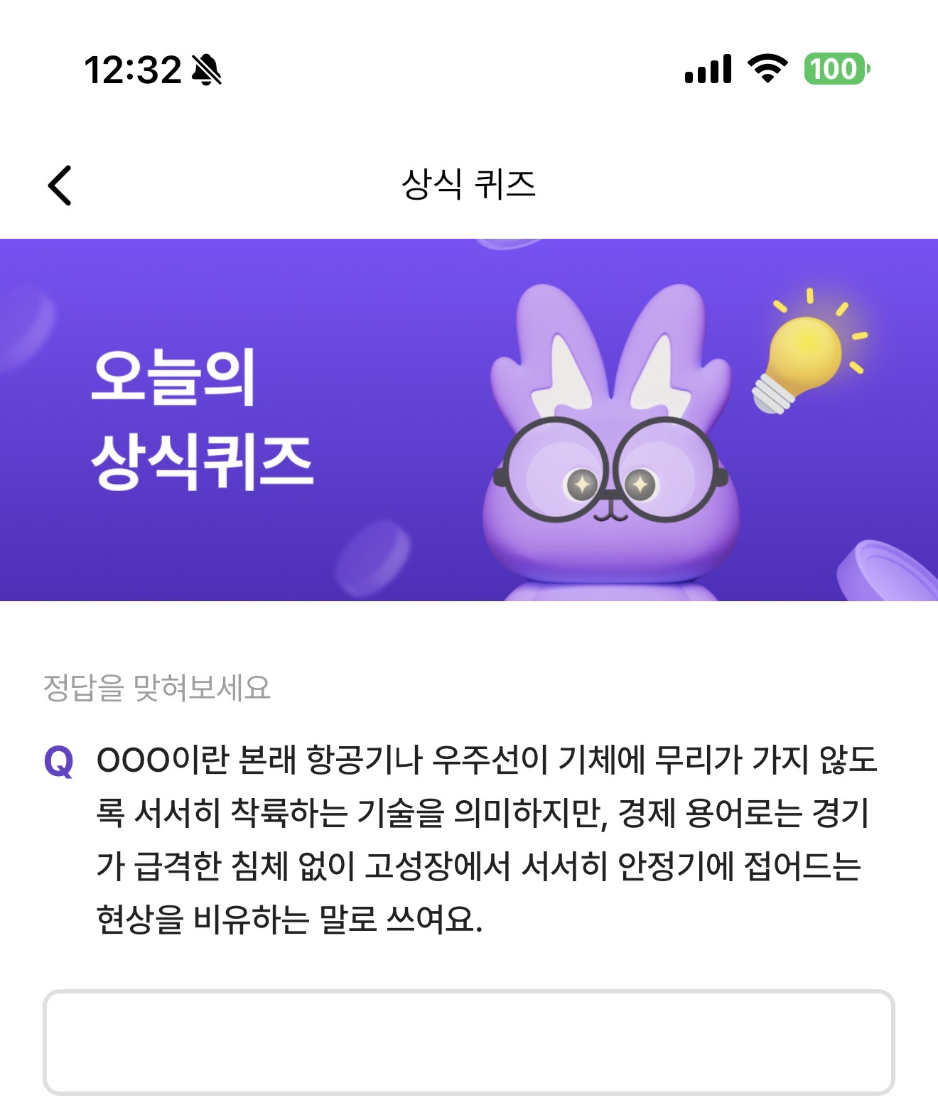 OOO이란 본래 항공기나 우주선이 기체에 무리가 가지 않도록 서서히 착륙하는 기술을 의미하지만, 경제 용어로는 경기가 급격한 침체 없이 고성장에서 서서히 안정기에 접어드는 현상을 비유하는 말로 쓰여요. 주관식 퀴즈인데요.