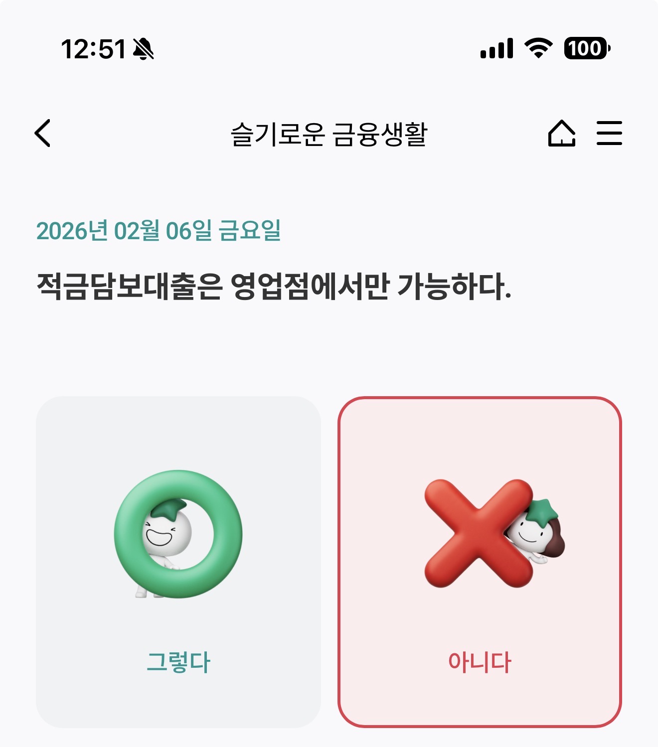 하나원큐 슬기로운 금융생활 OX퀴즈 2월 6일 정답(적금담보대출은 영업점에서만 가능하다)