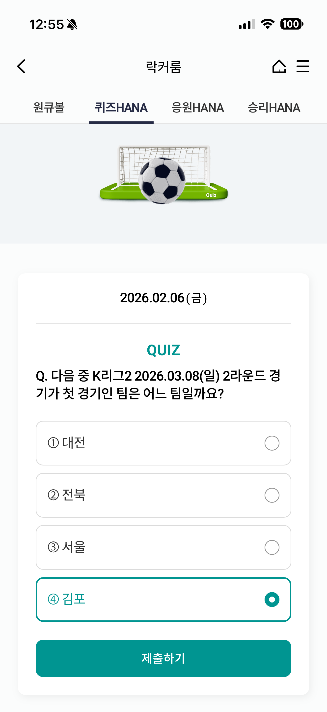 하나원큐 축구 play 퀴즈 HANA 정답은 김포 입니다