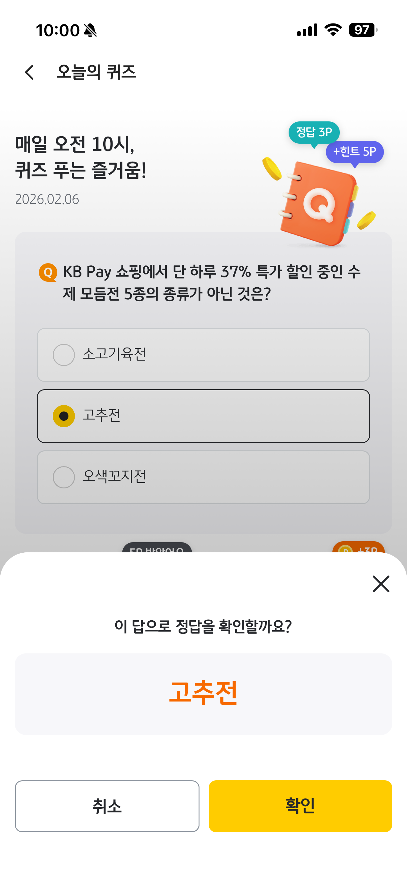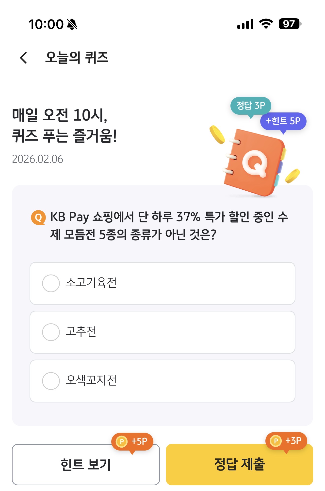 KB Pay 오늘의 퀴즈 2월 6일 문제입니다