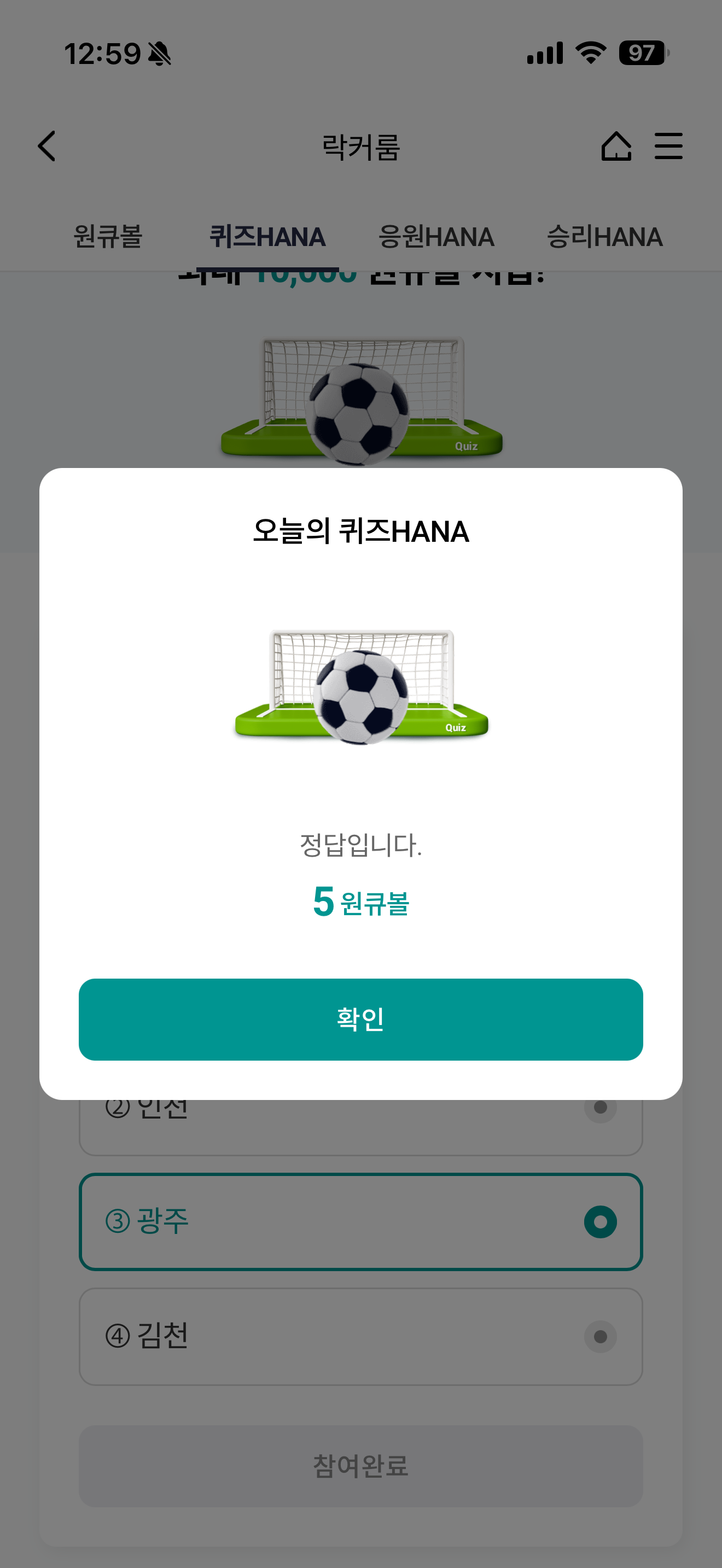 하나원큐 축구 play 퀴즈 HANA 정답은 광주 입니다