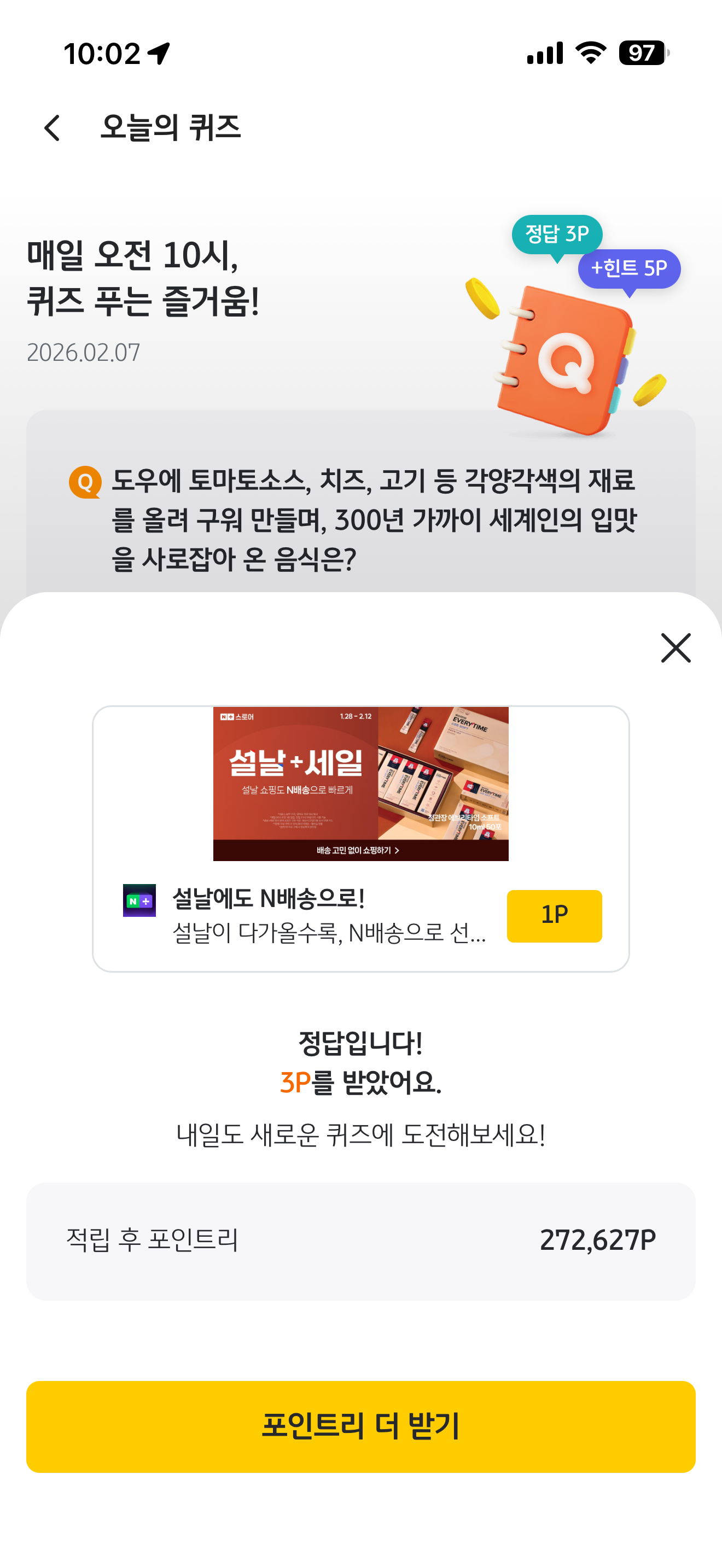 KB Pay 오늘의 퀴즈 정답은 피자 입니다