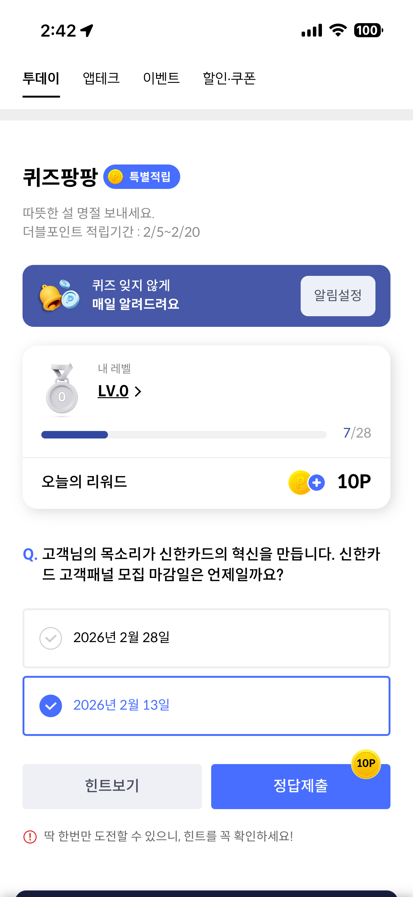 신한카드 퀴즈팡팡 정답은 2026년 2월 13일입니다