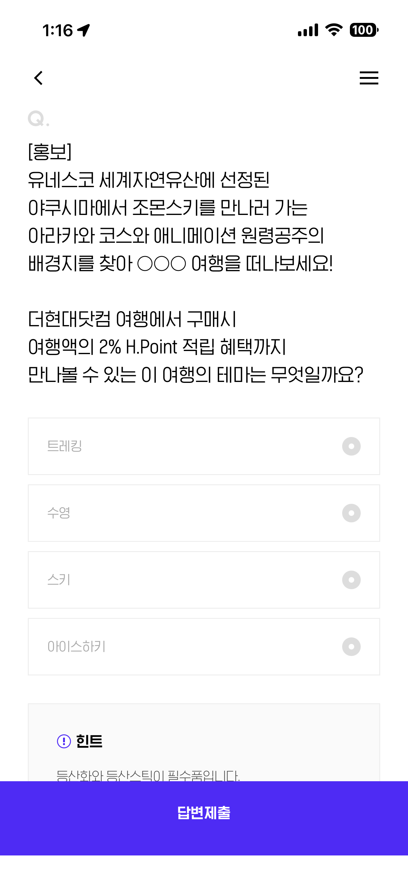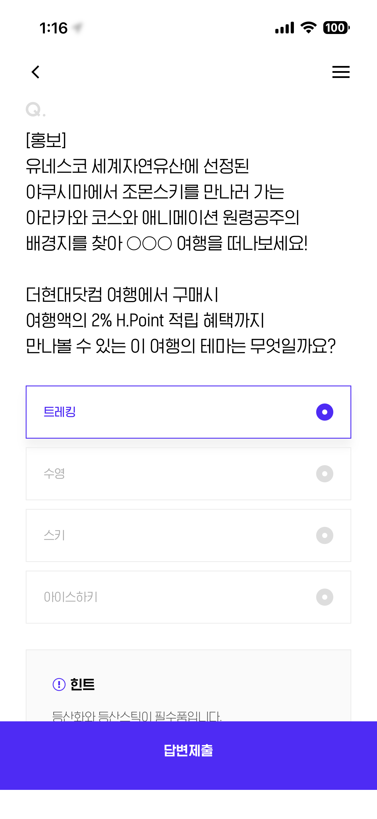 H포인트 퀴즈 정답은 트레킹 입니다