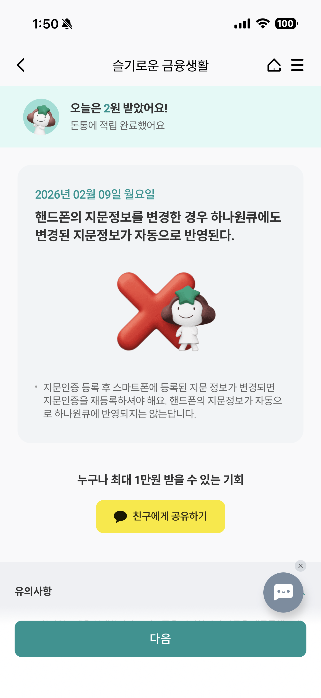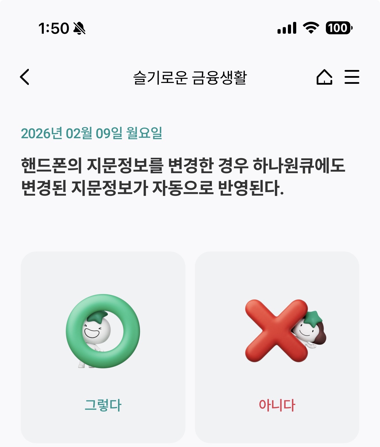 핸드폰의 지문정보를 변경한 경우 하나원큐에도 변경된 지문정보가 자동으로 반영된다. 그렇다 아니다 선택하면 되는데요. 핸드폰의 지문정보를 변경하면 하나원큐에서 자동으로 반영이 될까요? 잘 참고해 두세요