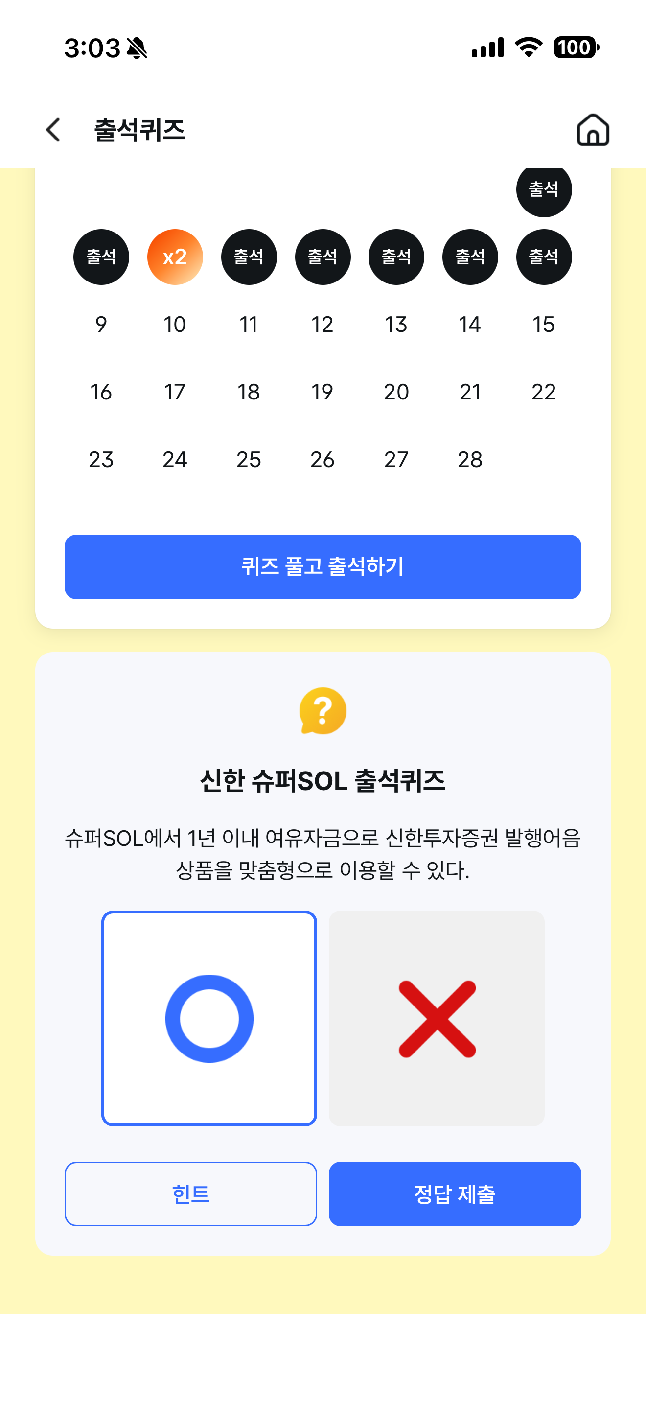 신한 슈퍼SOL 출석퀴즈 정답은 O 입니다
