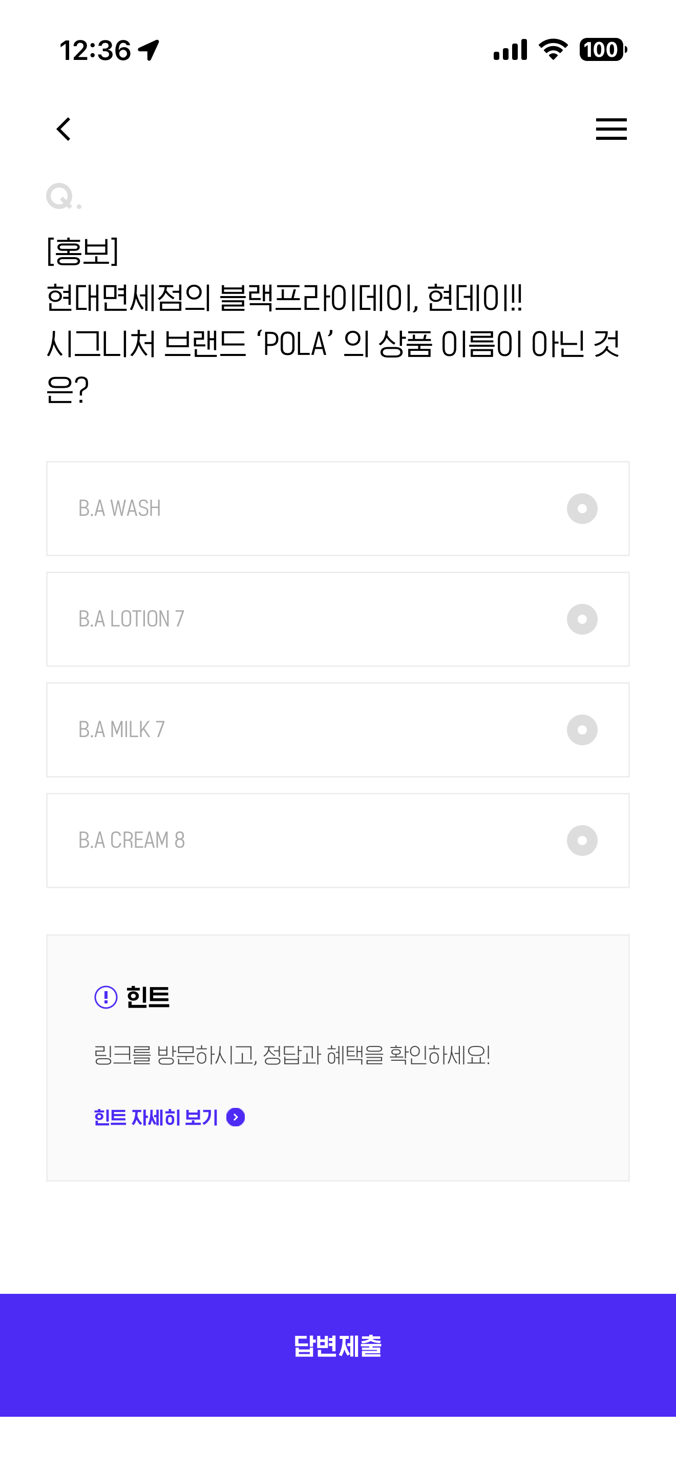 현대면세점의 블랙프라이데이, 현데이!! 시그니처 브랜드 'POLA' 의 상품 이름이 아닌 것은? 보기는 1. B.A WASH 2. B.A LOTION 7 3. B.A MILK 7 4. B.A CREAM 8 입니다