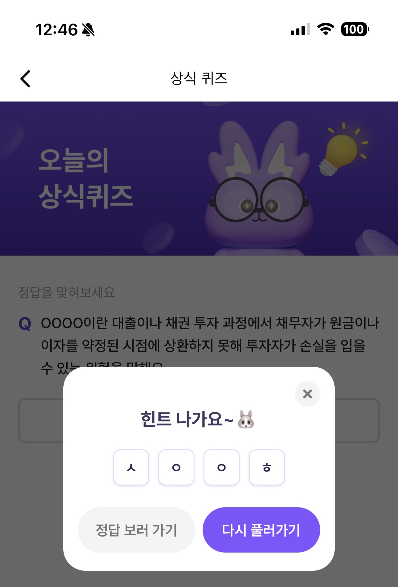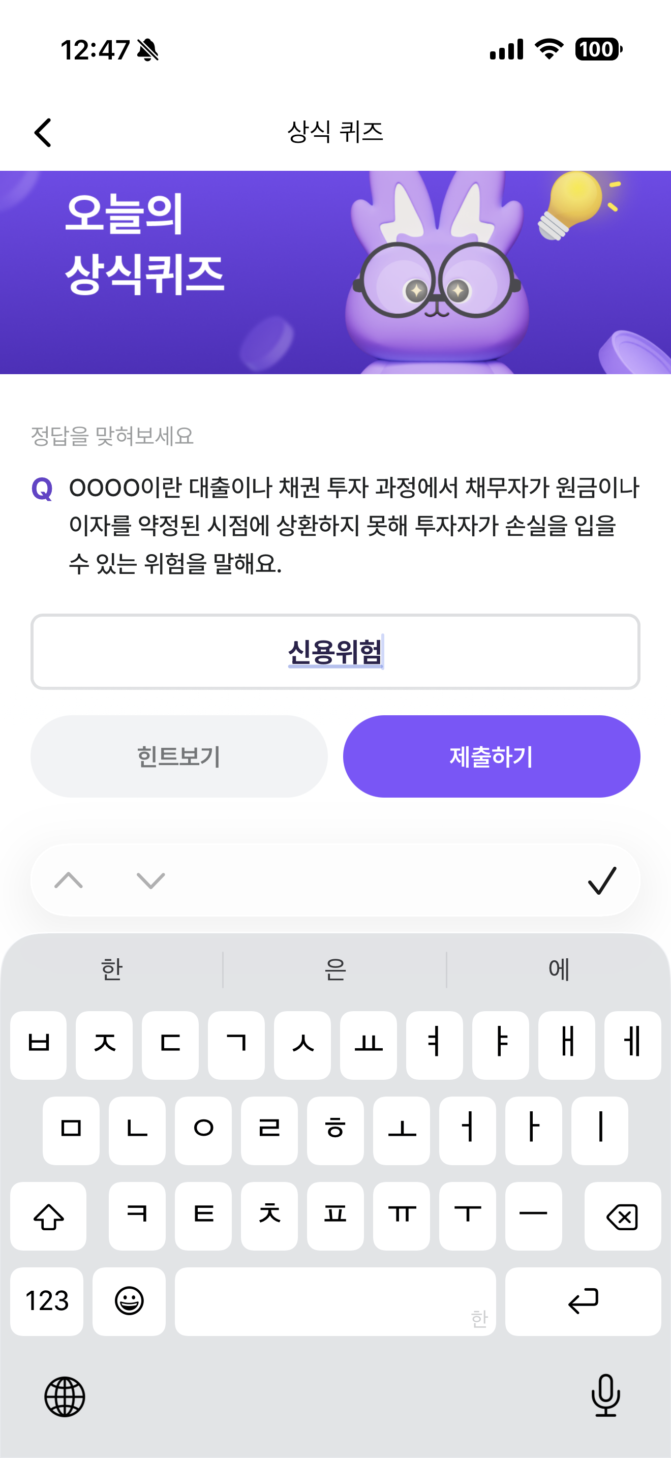 OOOO이란 대출이나 채권 투자 과정에서 채무자가 원금이나 이자를 약정된 시점에 상환하지 못해 투자자가 손실을 입을수 있는 위험을 말해요. 주관식 퀴즈인데요. 금융 상식으로 꼭 알아 두세요