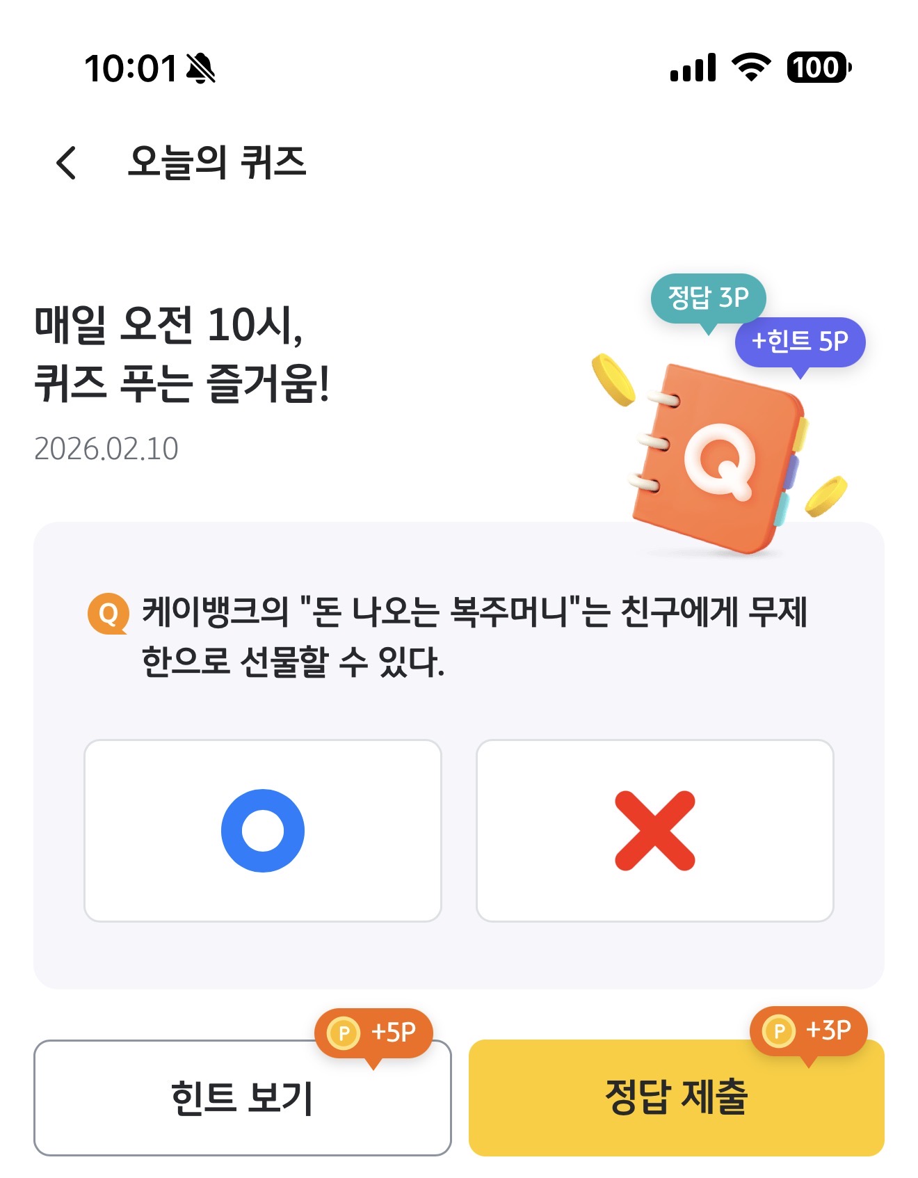 KB Pay 오늘의 퀴즈 2월 10일 정답(케이뱅크의 "돈 나오는 복주머니"는 친구에게 무제한으로 선물할 수 있다)