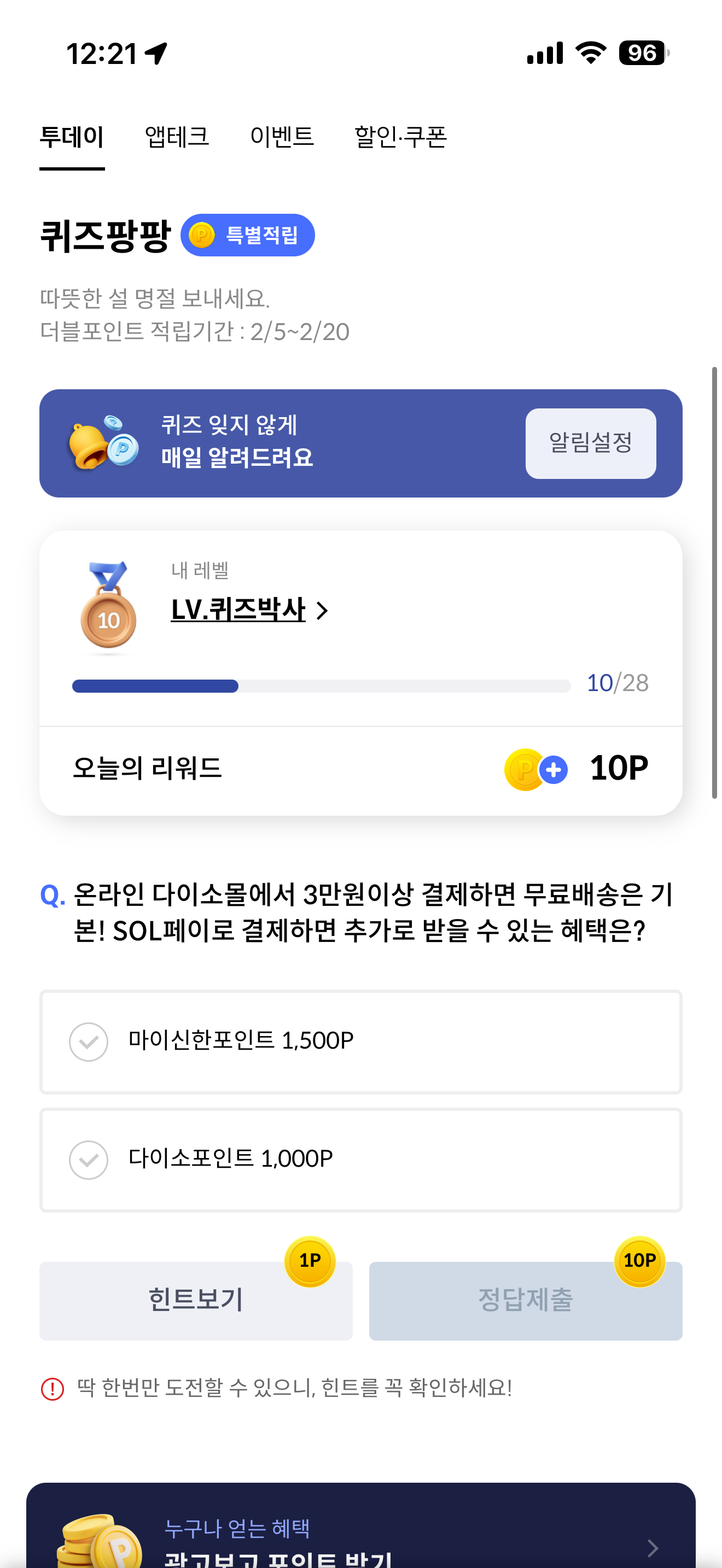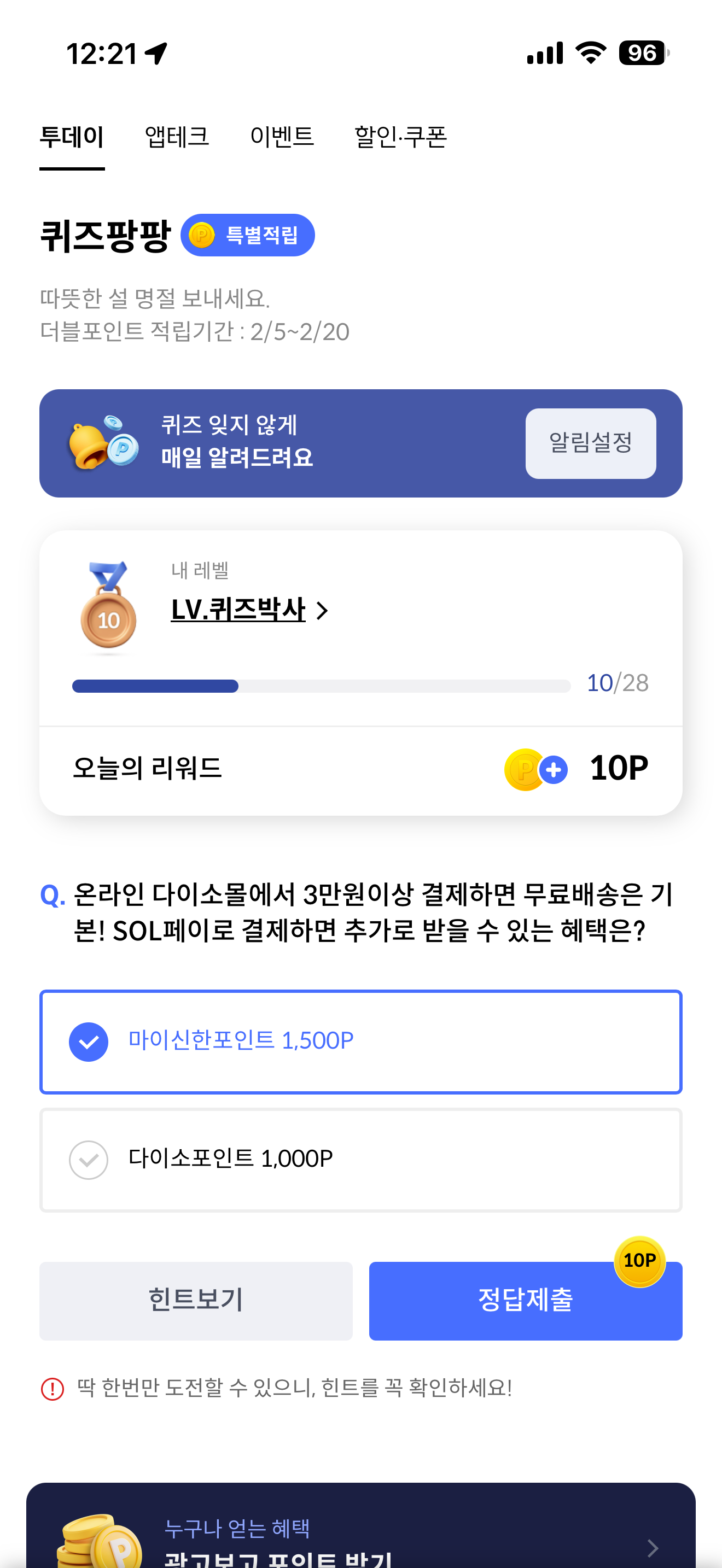 신한카드 퀴즈팡팡 정답은 마이신한포인트 1,500P 입니다