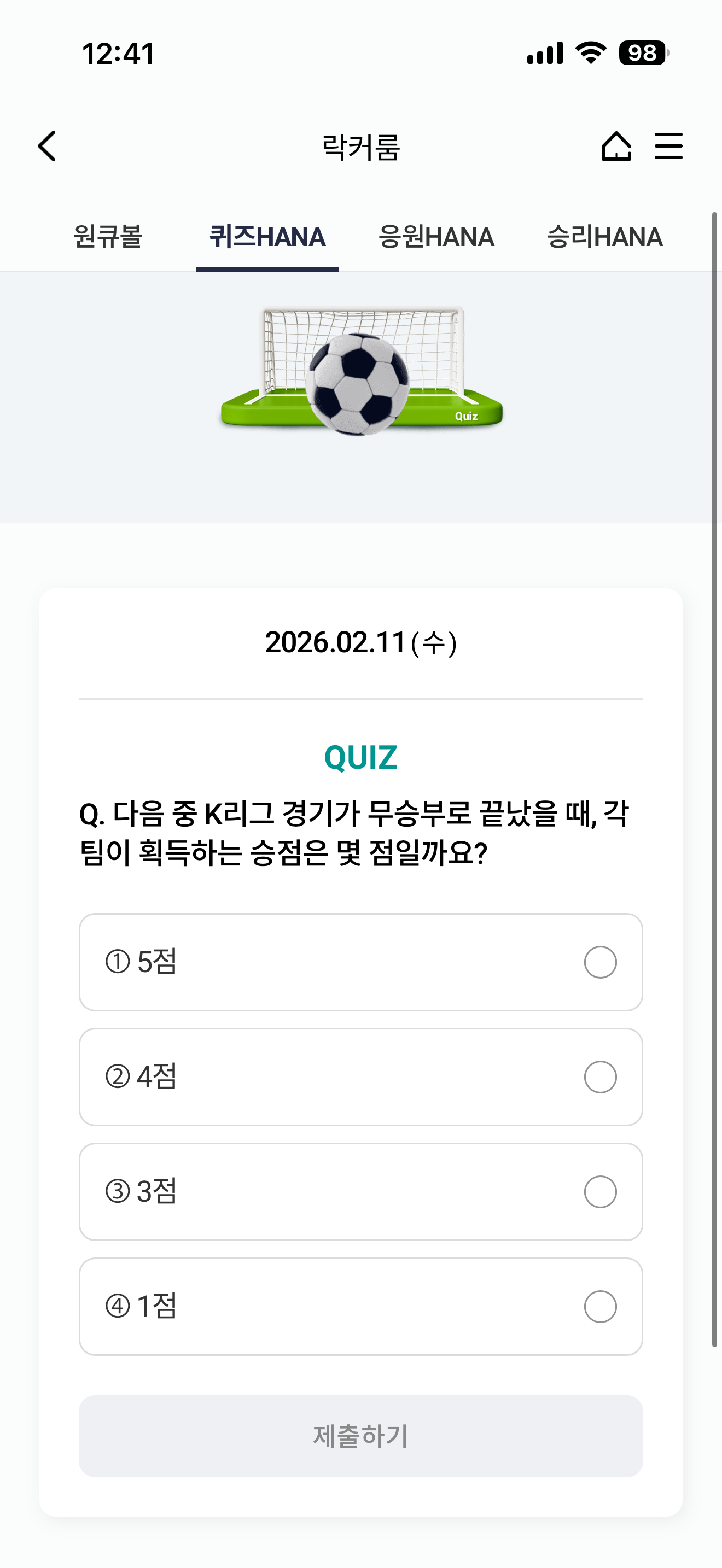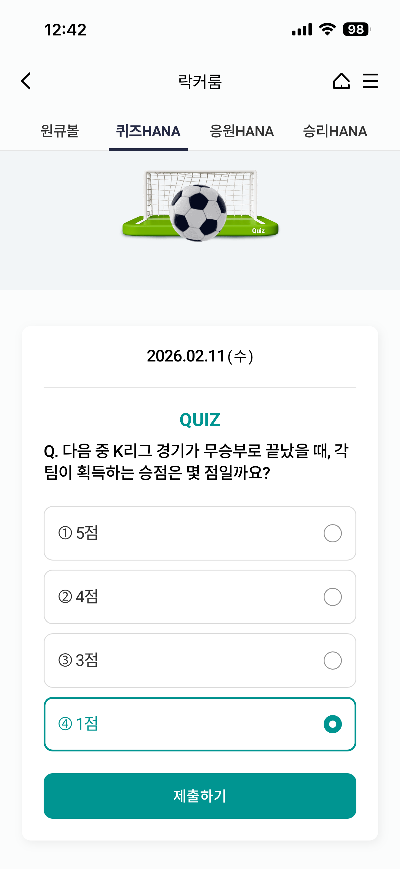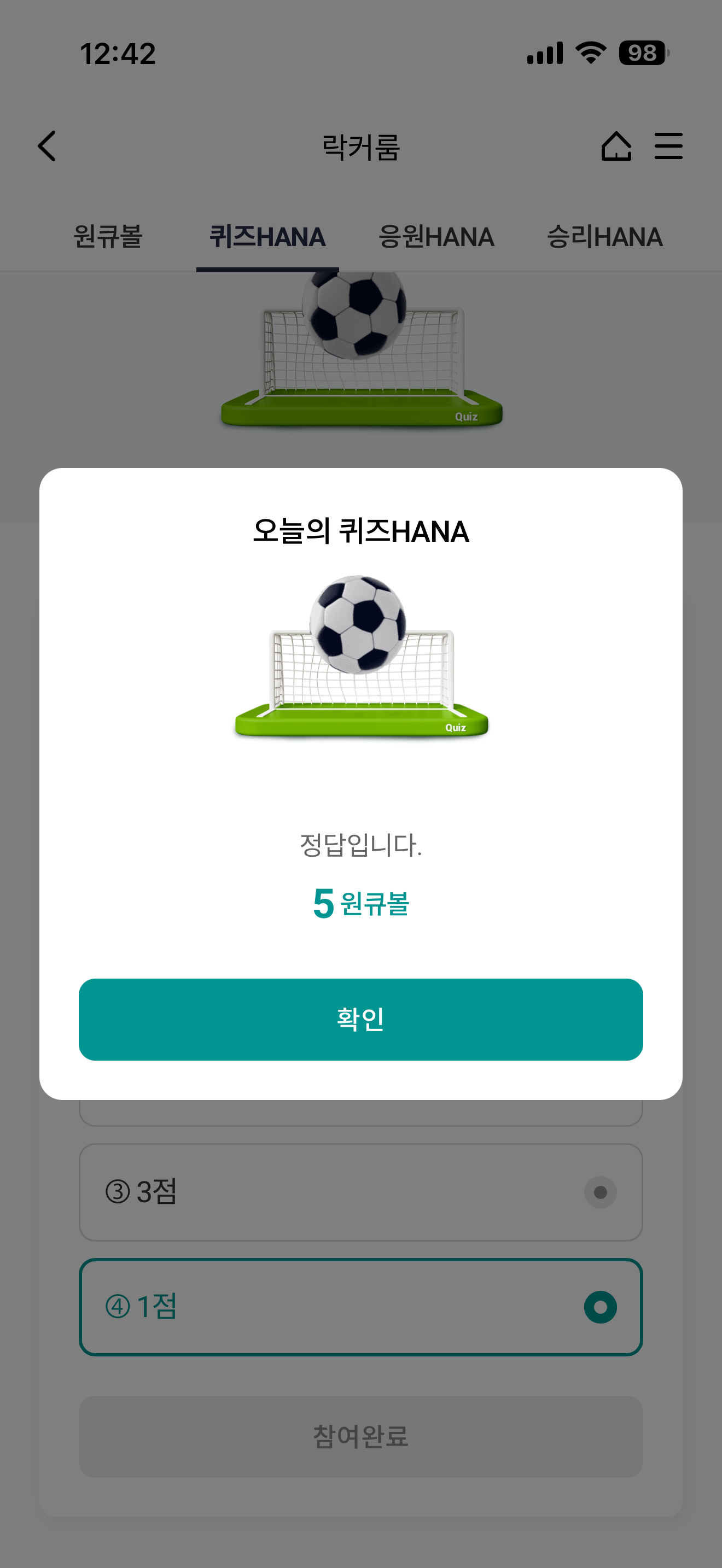 하나원큐 축구 play 퀴즈 HANA 정답은 1점 입니다
