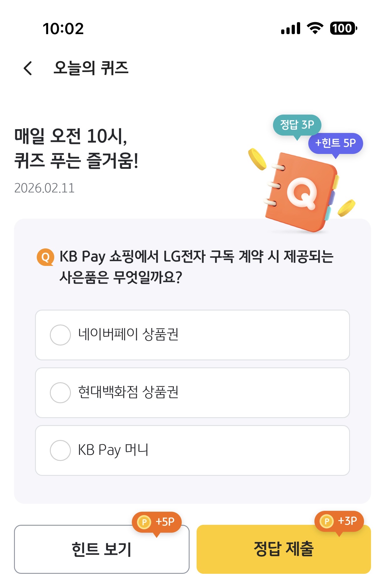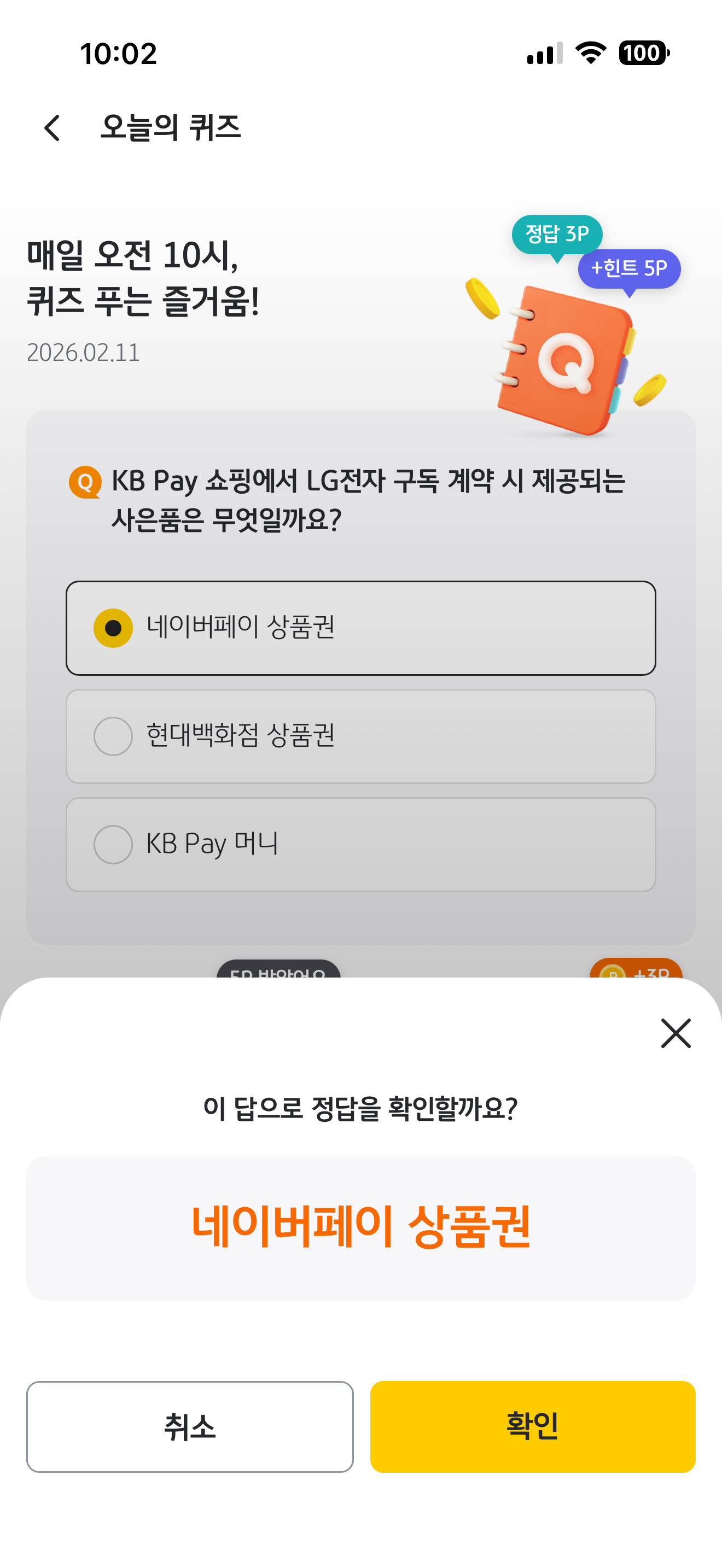 KB Pay 오늘의 퀴즈 정답은 네이버페이 상품권 입니다