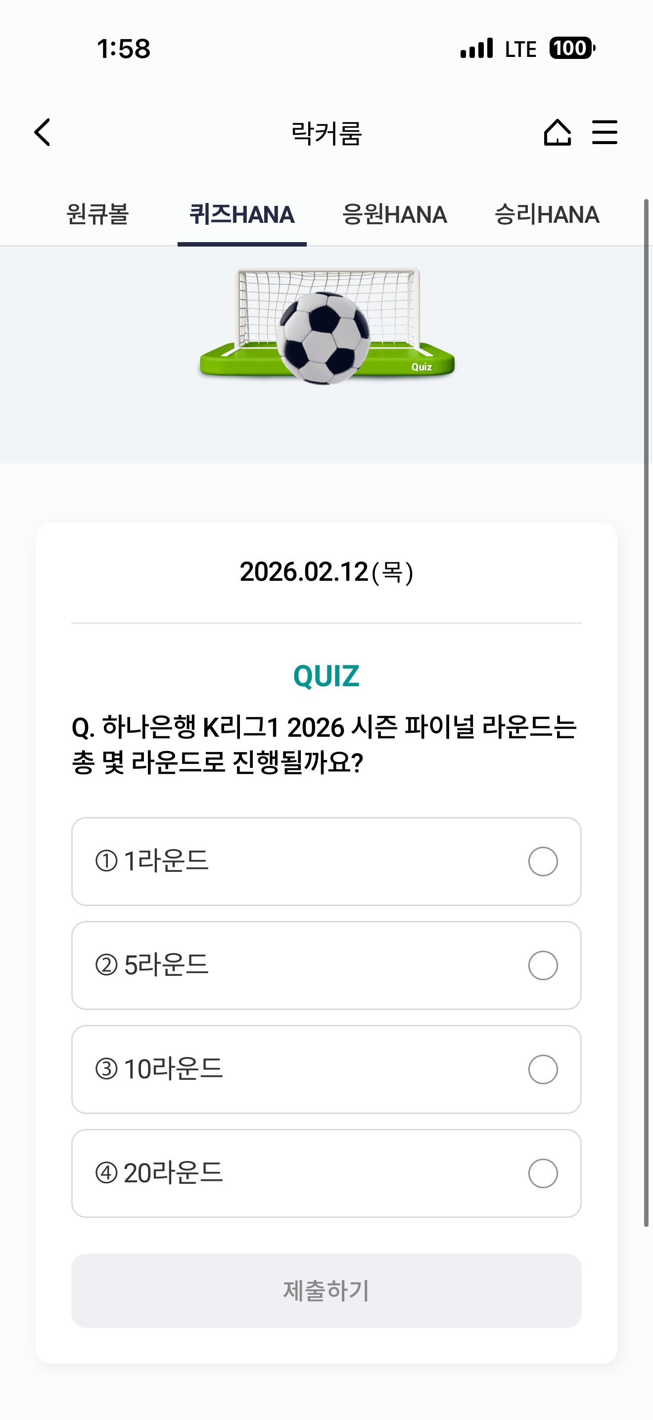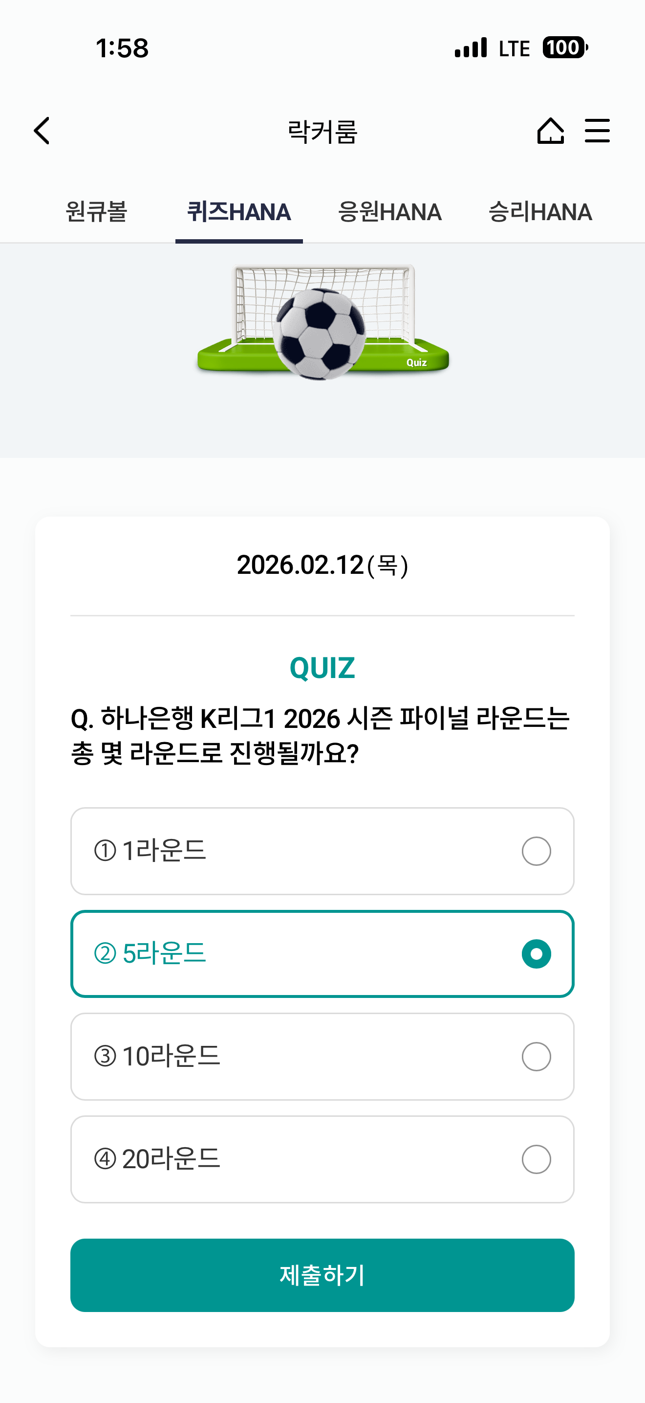 하나원큐 축구 play 퀴즈 HANA 2월 12일 정답(하나은행 K리그1 2026 시즌 파이널 라운드는 총 몇 라운드로 진행될까요?)