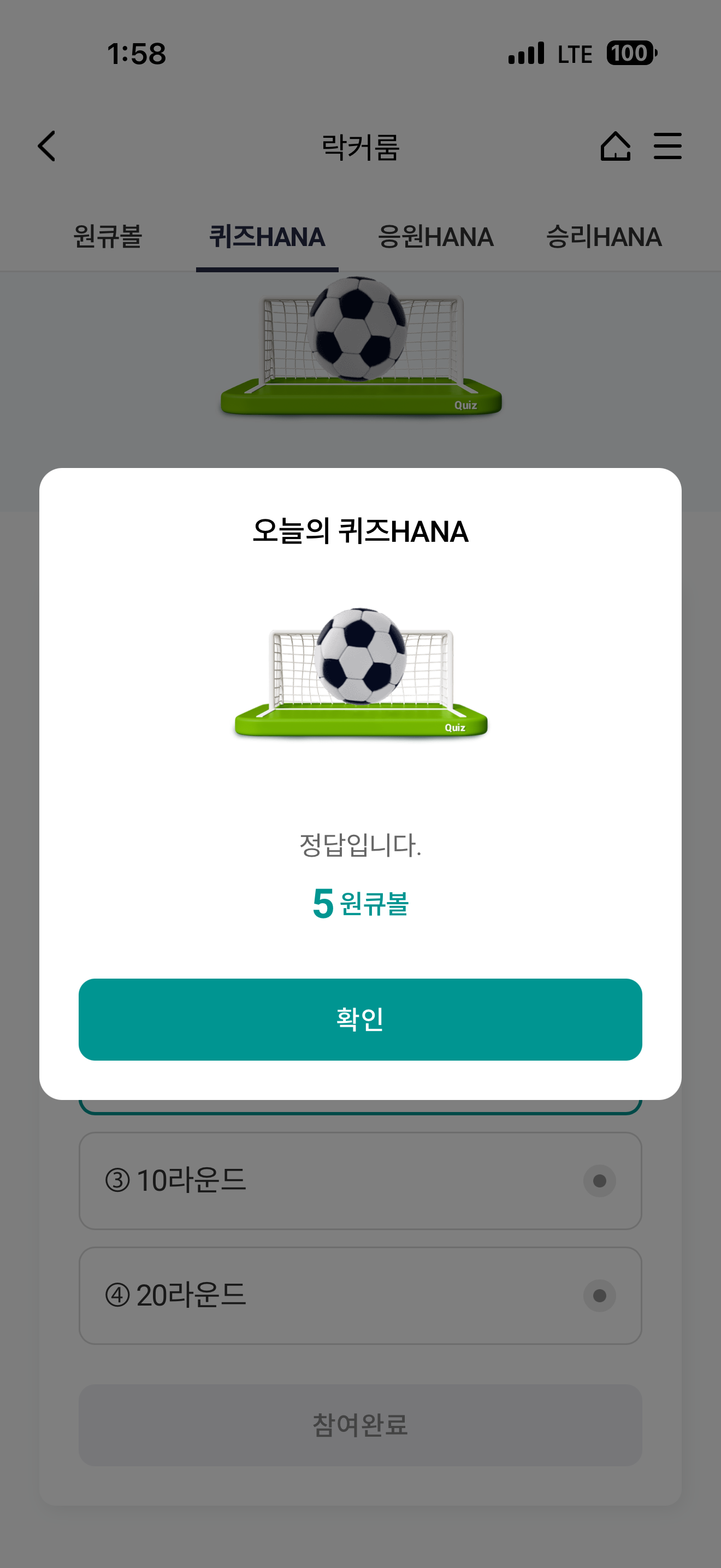 하나원큐 축구 play 퀴즈 HANA 정답은 5라운드 입니다