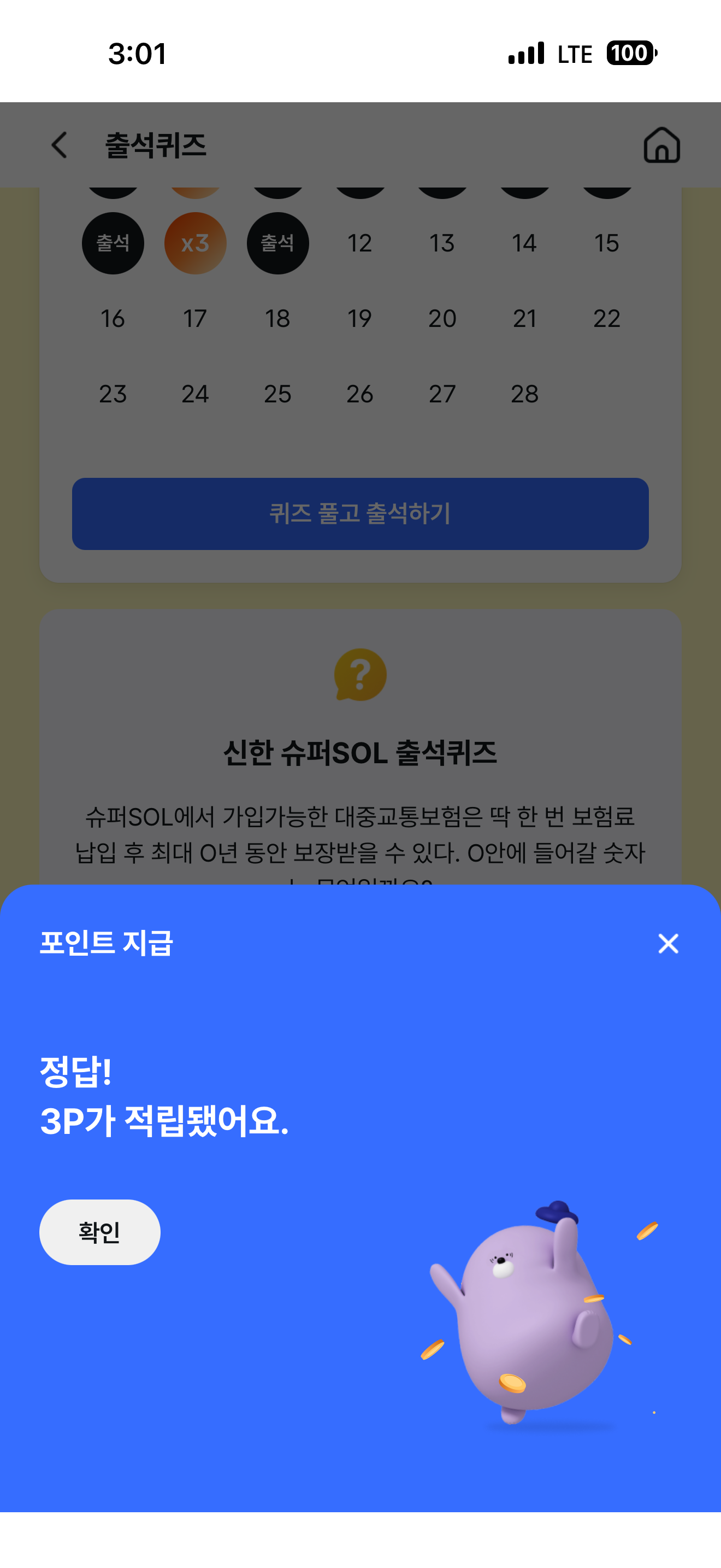 신한 슈퍼SOL 출석퀴즈 정답은 3년 입니다