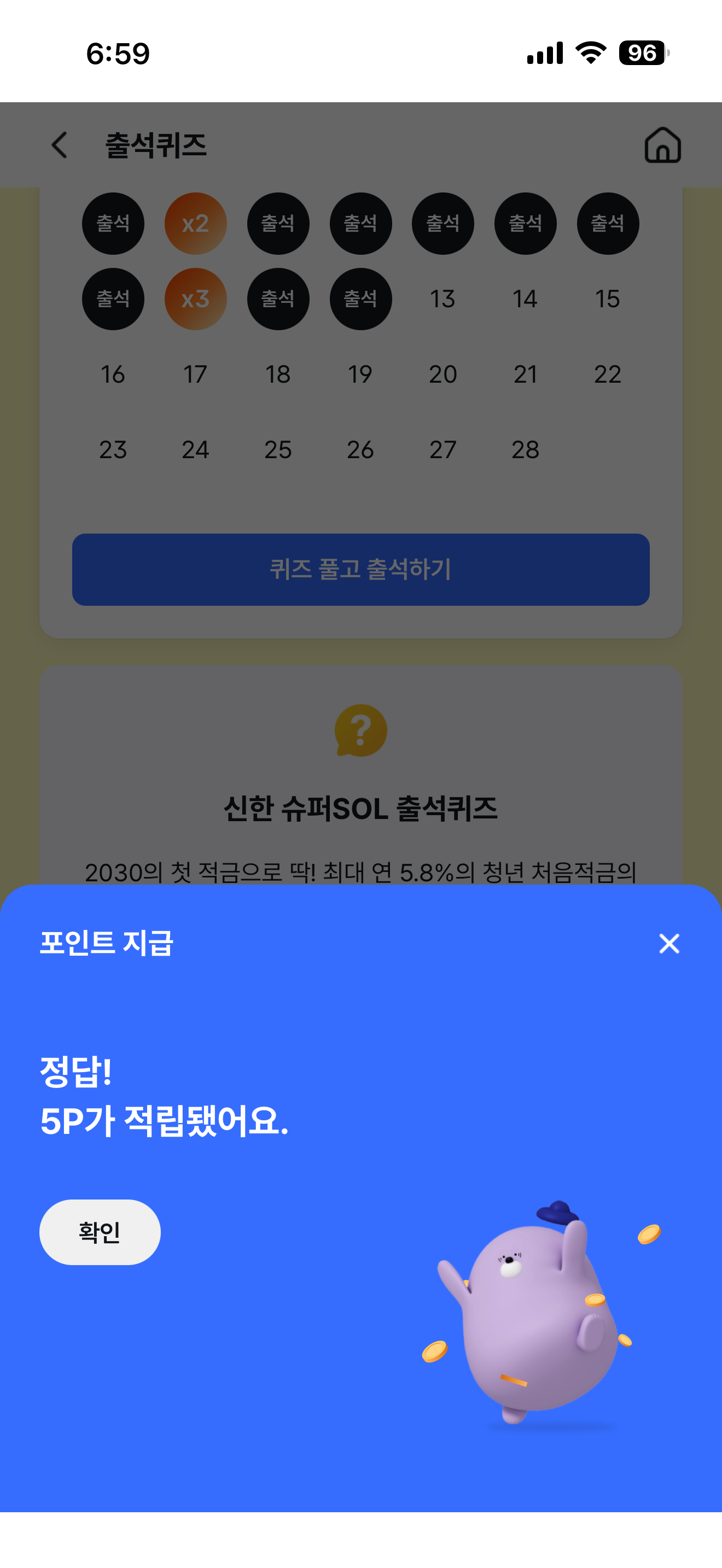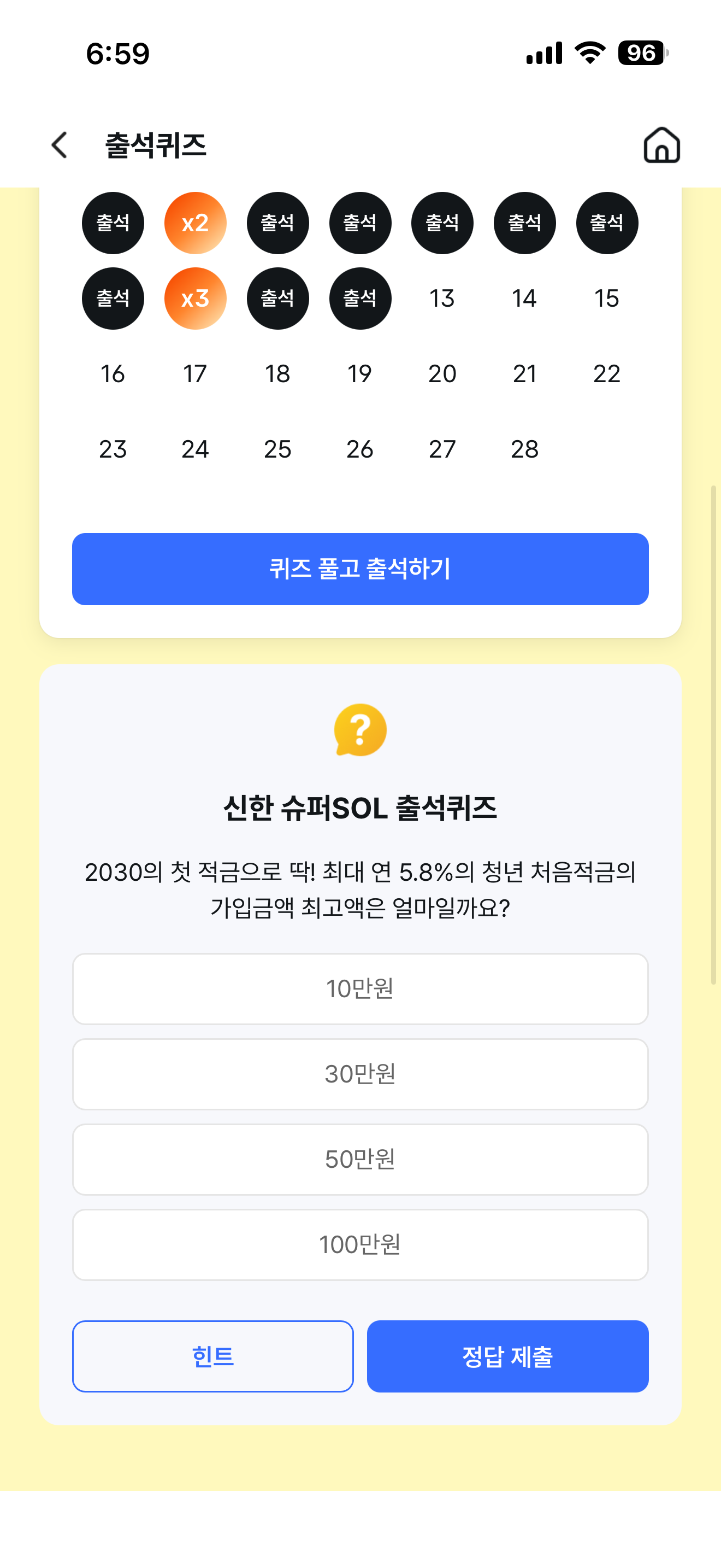 신한 슈퍼SOL 출석퀴즈 2월 13일 정답(2030의 첫 적금으로 딱! 최대 연 5.8%의 청년 처음적금의 가입금액 최고액은 얼마일까요?)