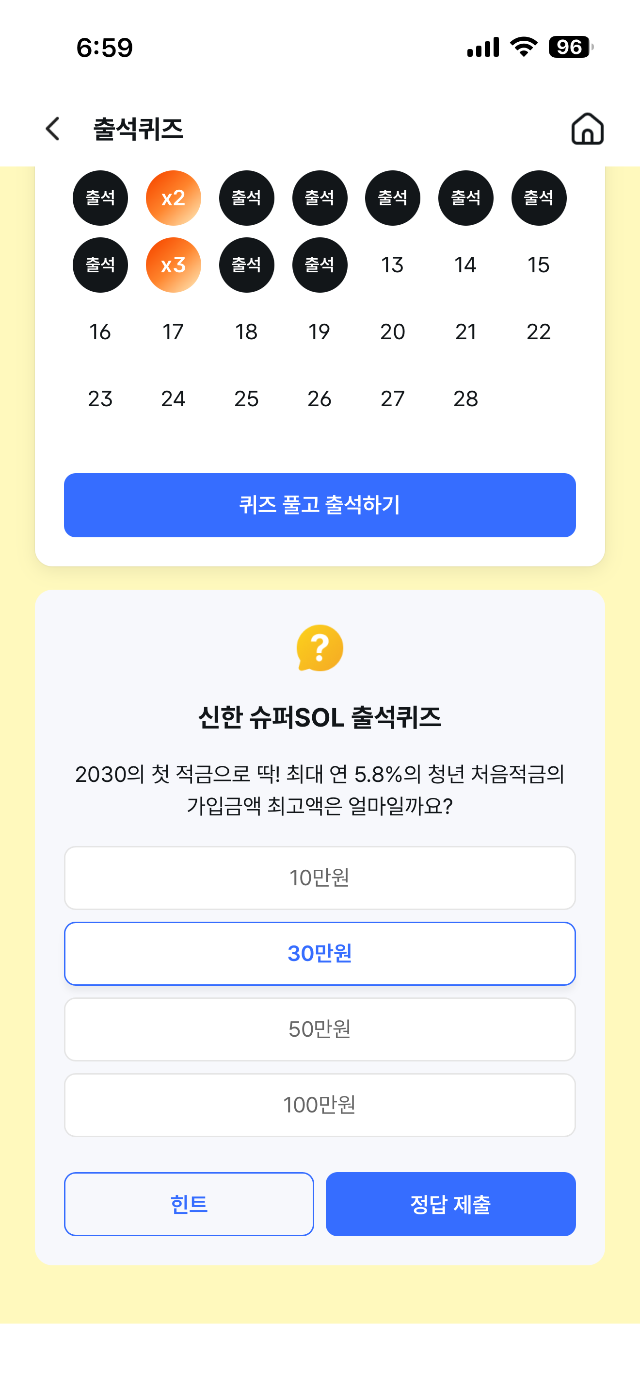 신한 슈퍼SOL 출석퀴즈 정답은 30만원 입니다