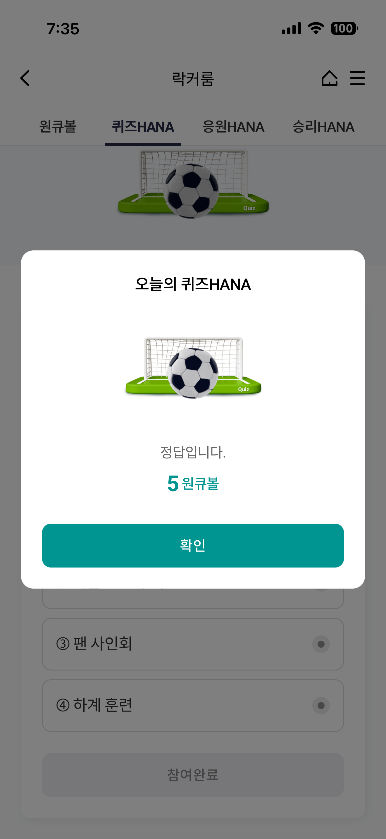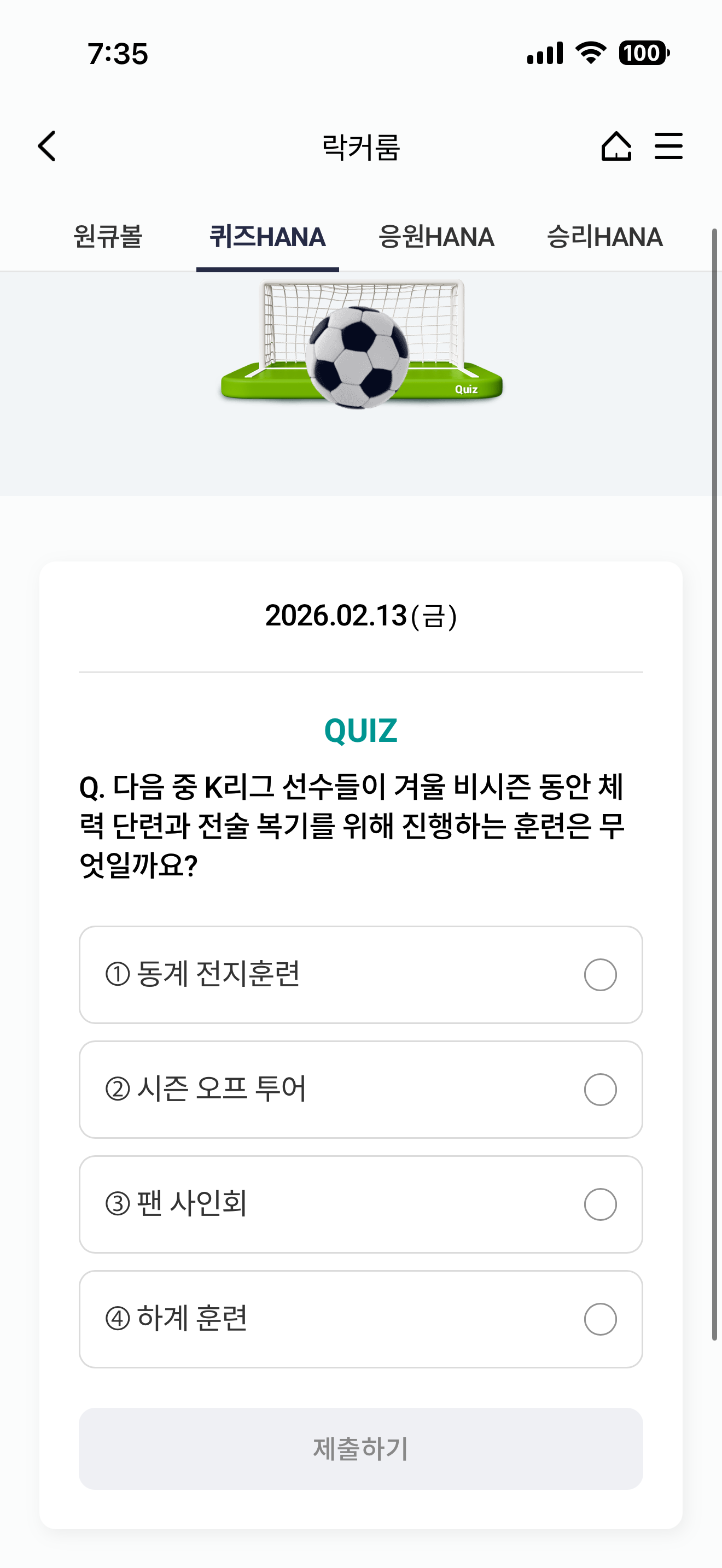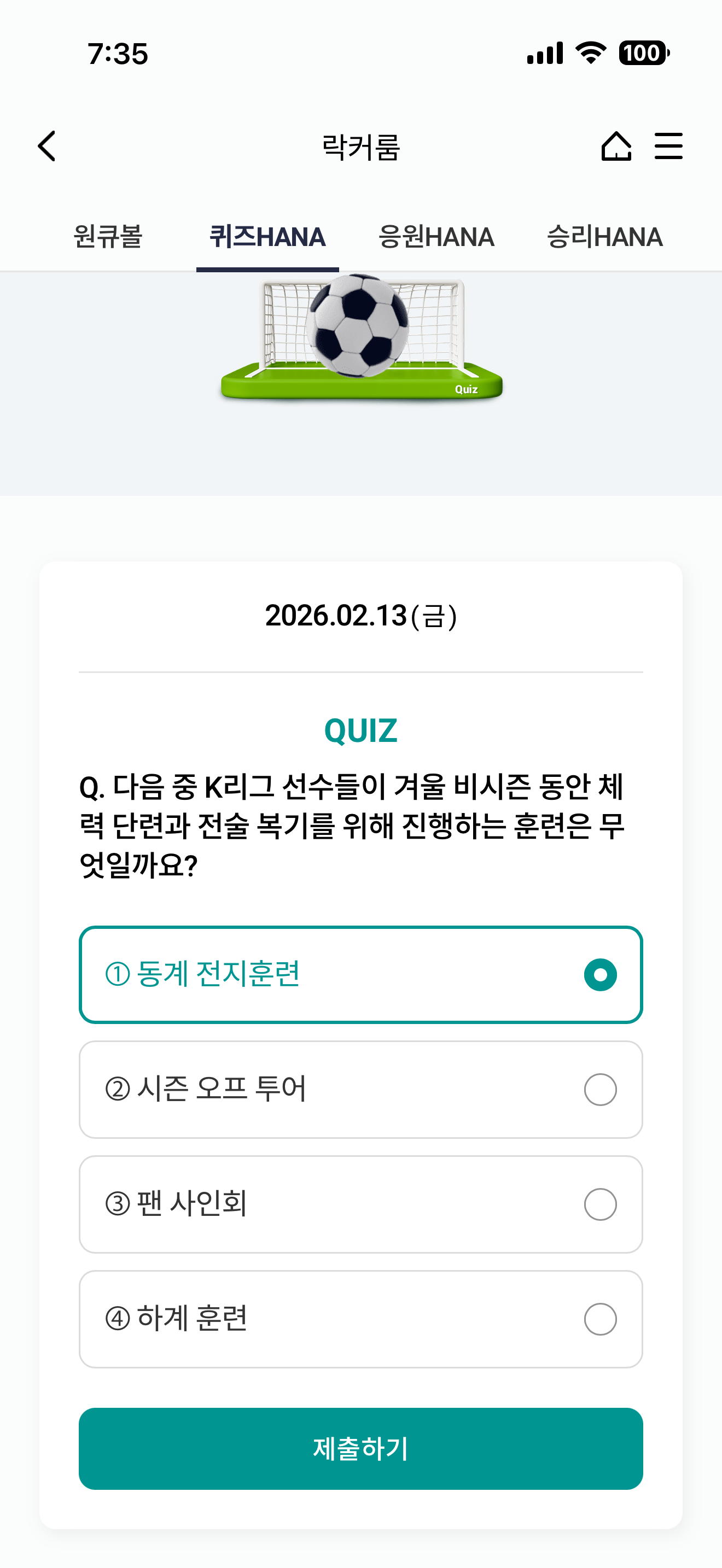 하나원큐 축구 play 퀴즈 HANA 정답은 동계 전지훈련 입니다