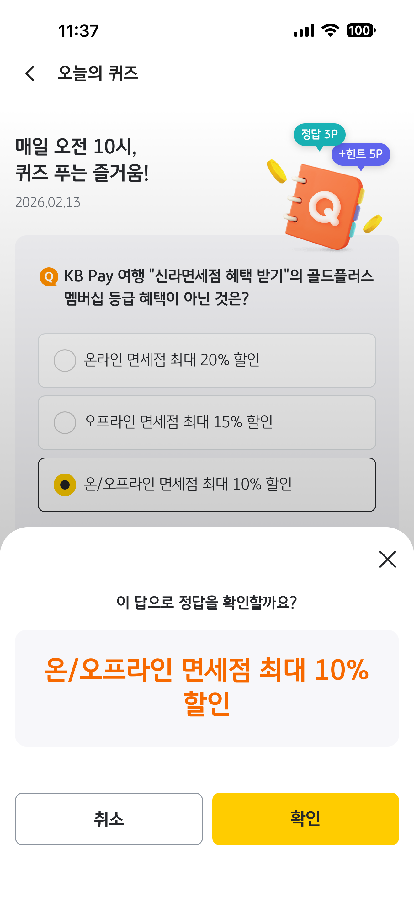 KB Pay 오늘의 퀴즈 정답은 온/오프라인 면세점 최대 10% 할인 입니다