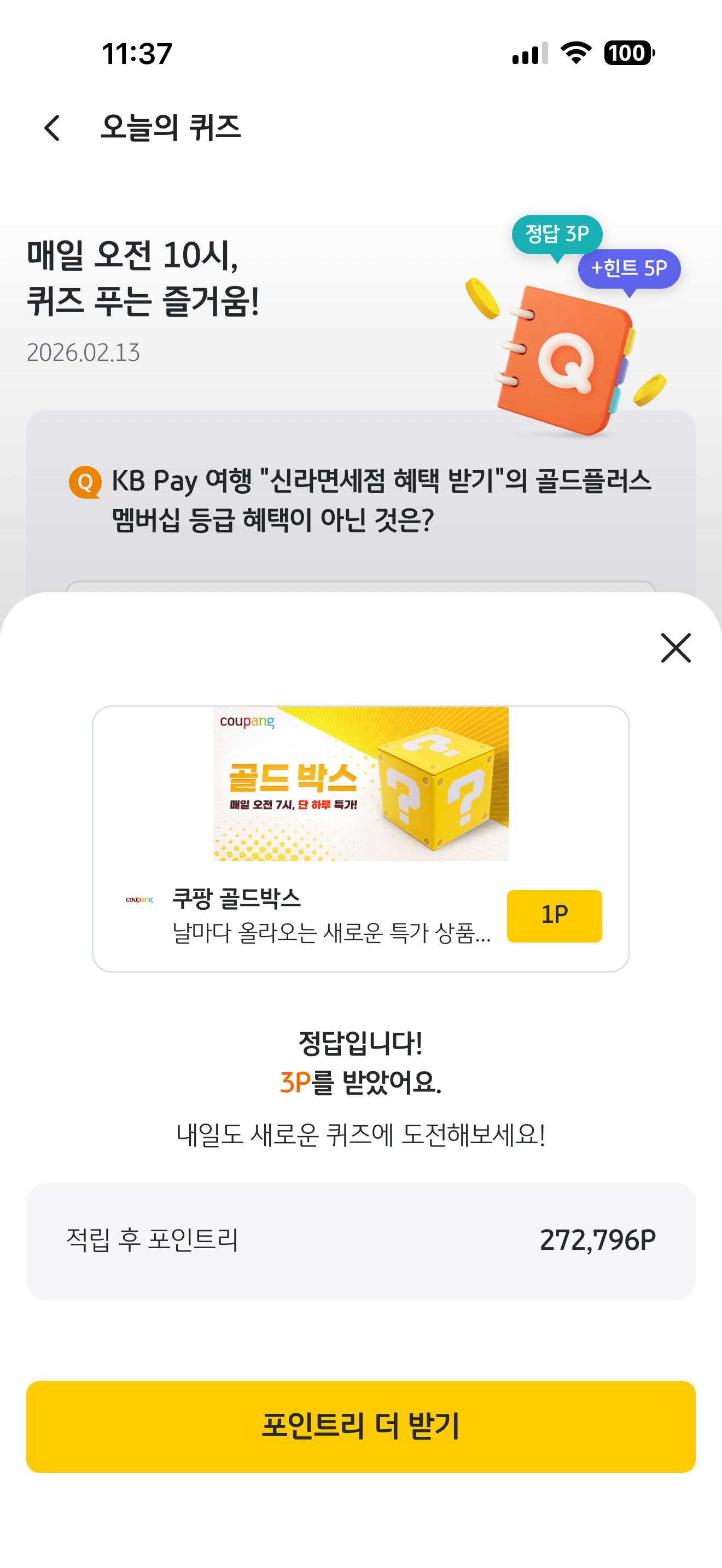 KB Pay 오늘의 퀴즈 2월 13일 문제입니다