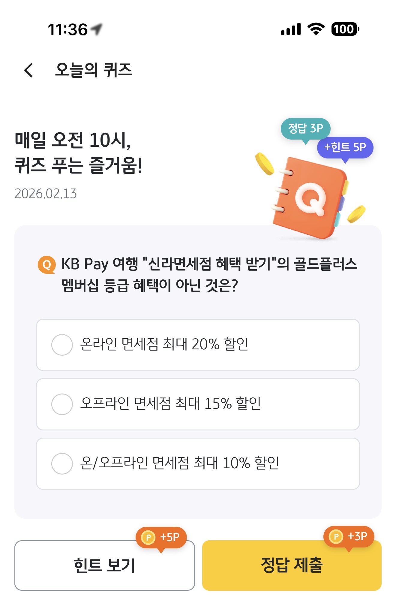 KB Pay 오늘의 퀴즈 정답은 온/오프라인 면세점 최대 10% 할인 입니다