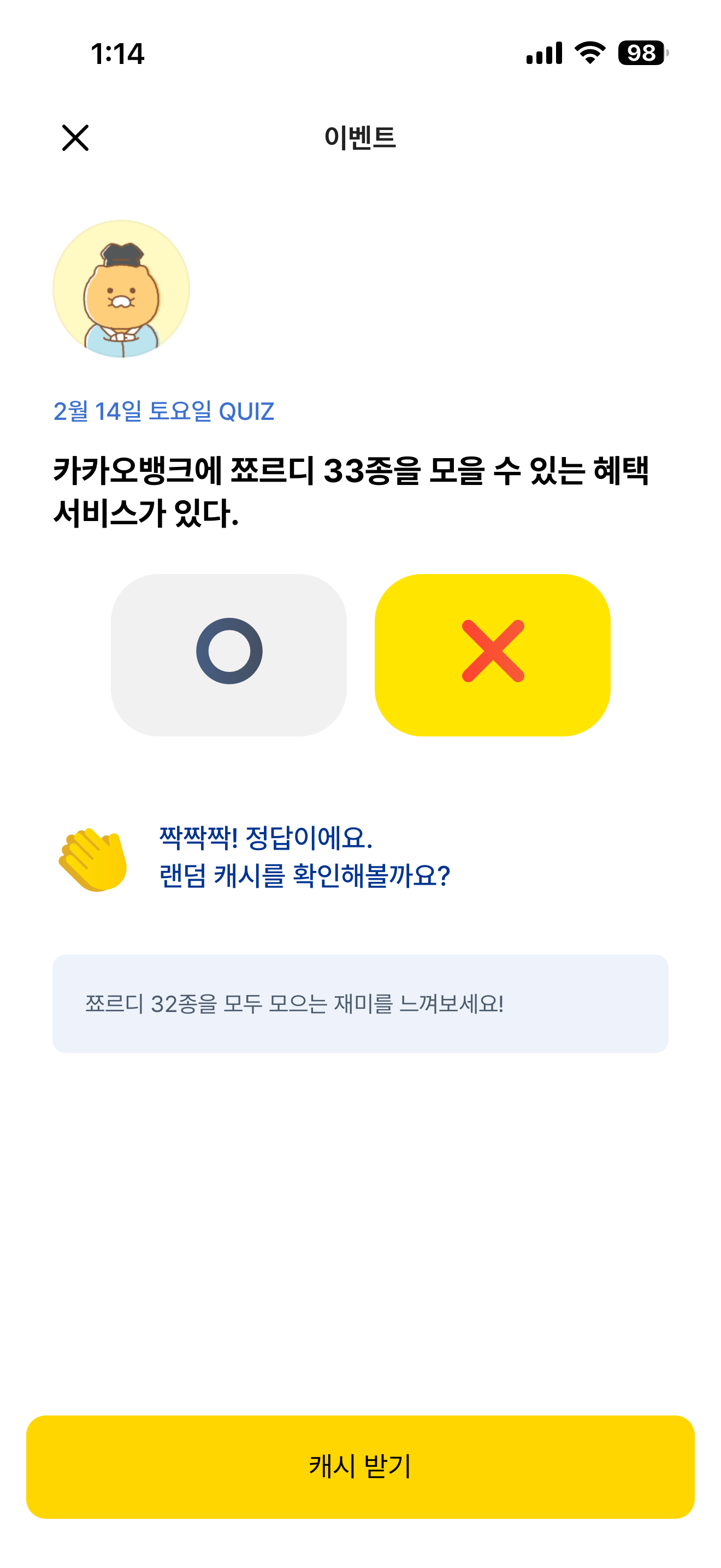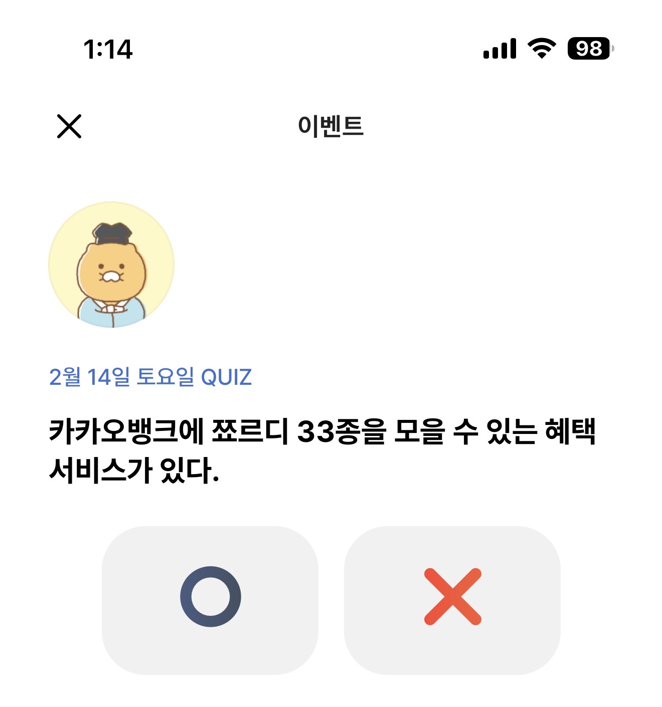 카카오뱅크 OX 퀴즈 정답은 X 입니다