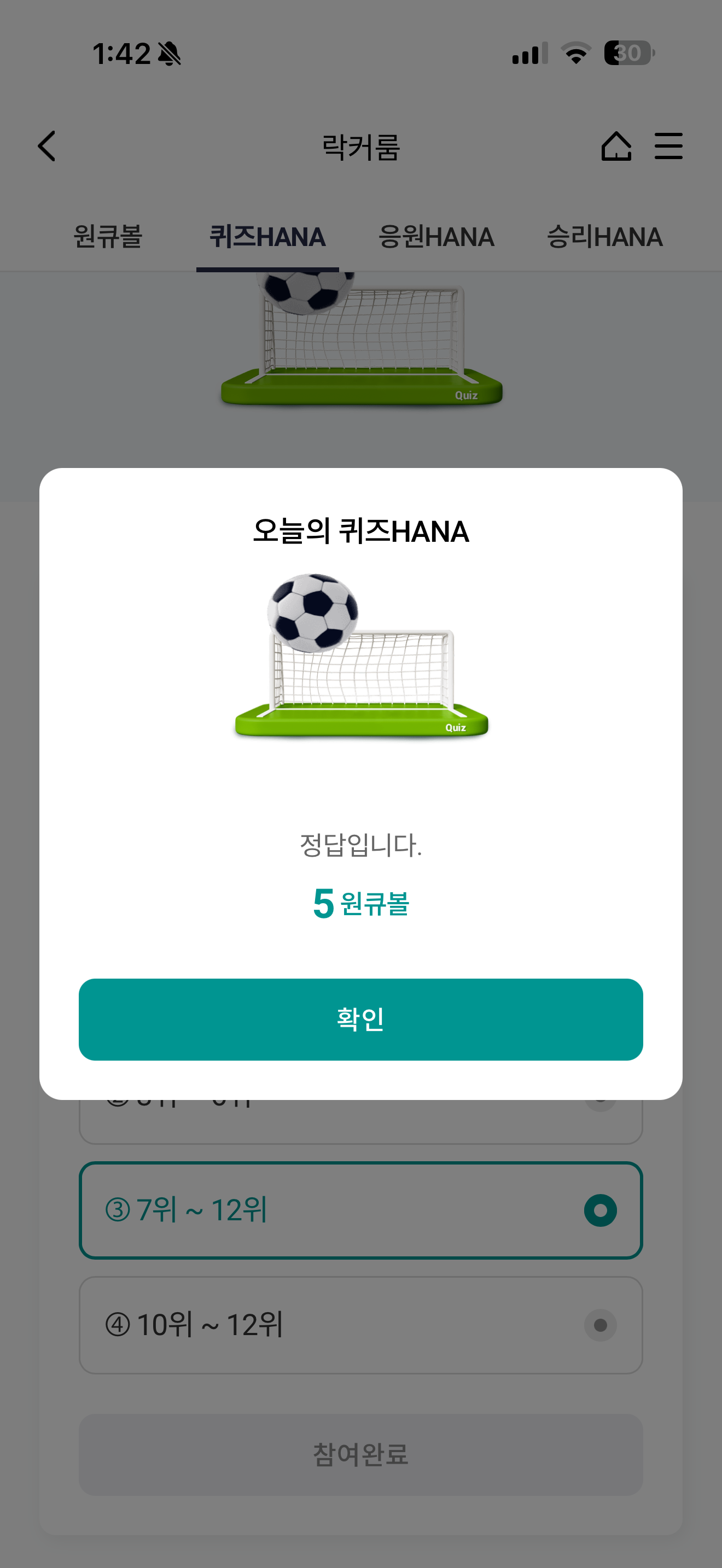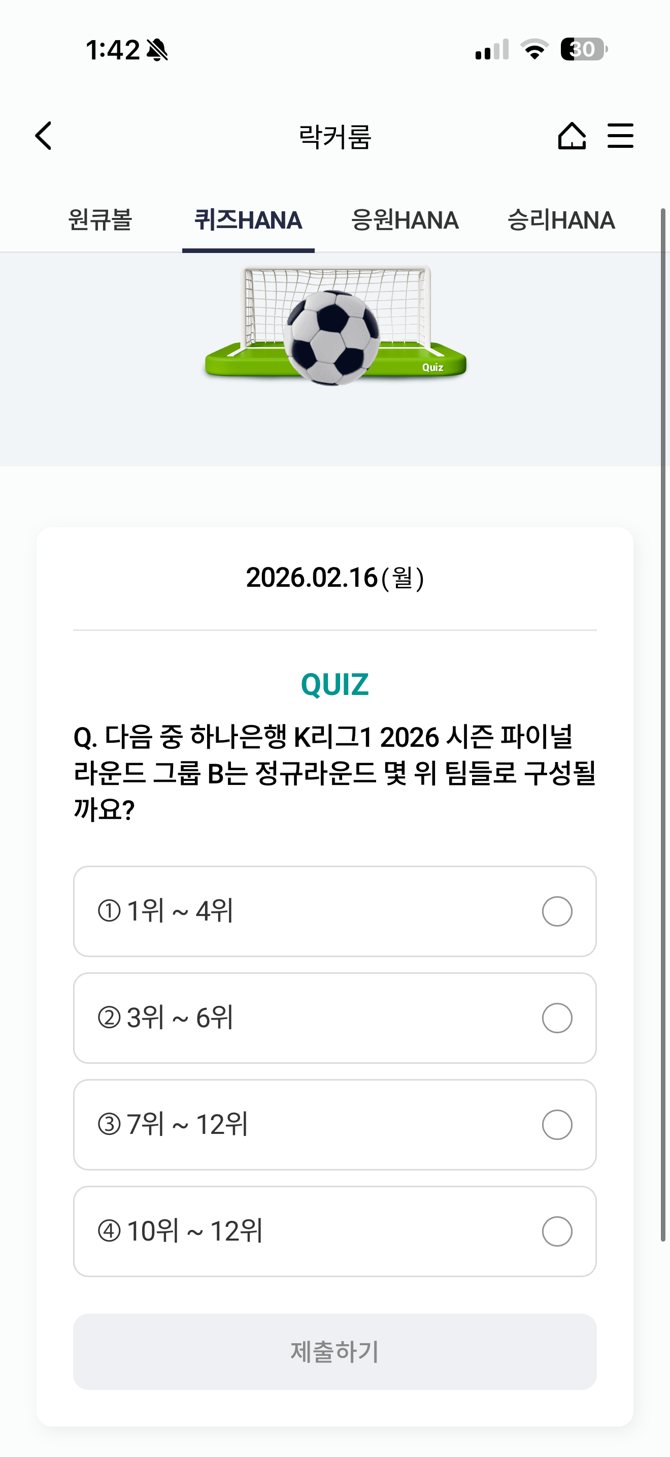 하나원큐 축구 play 퀴즈 HANA 정답은 7위 ~ 12위 입니다