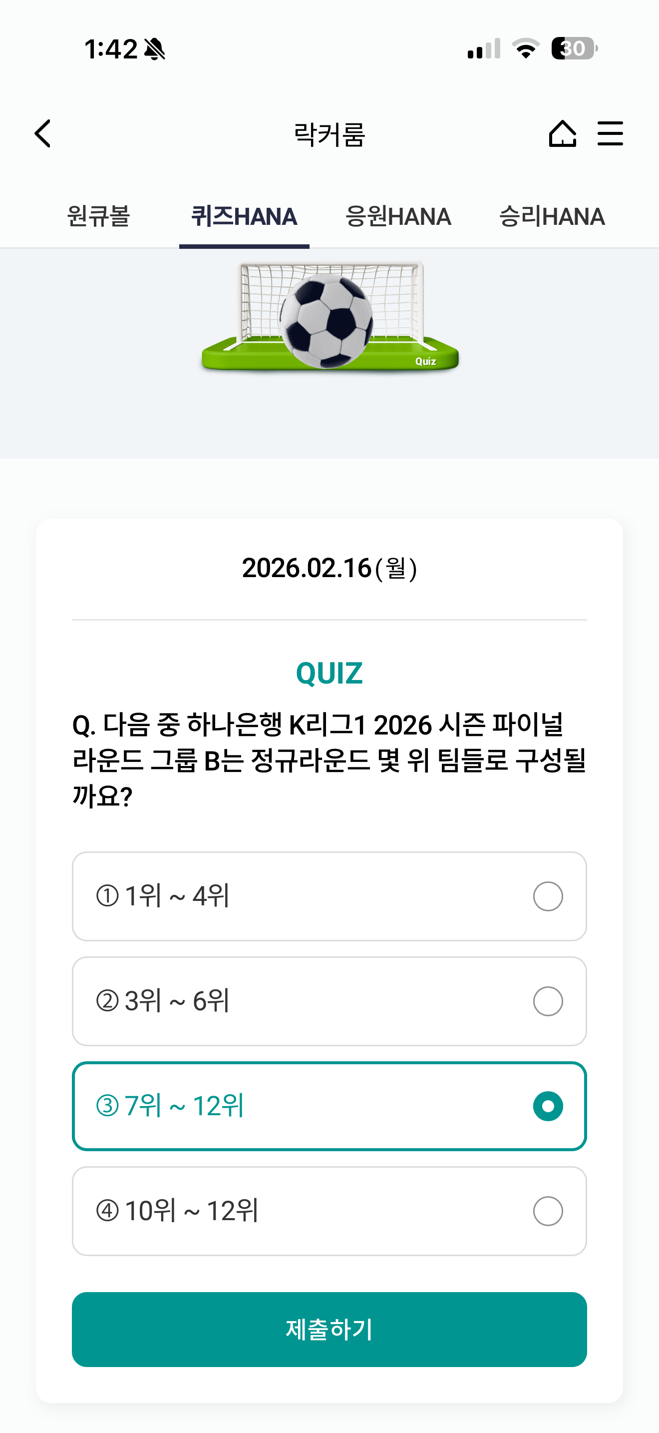 하나원큐 축구 play 퀴즈 HANA 2월 16일 정답(다음 중 하나은행 K리그1 2026 시즌 파이널 라운드 그룹 B는 정규라운드 몇 위 팀들로 구성될까요?)