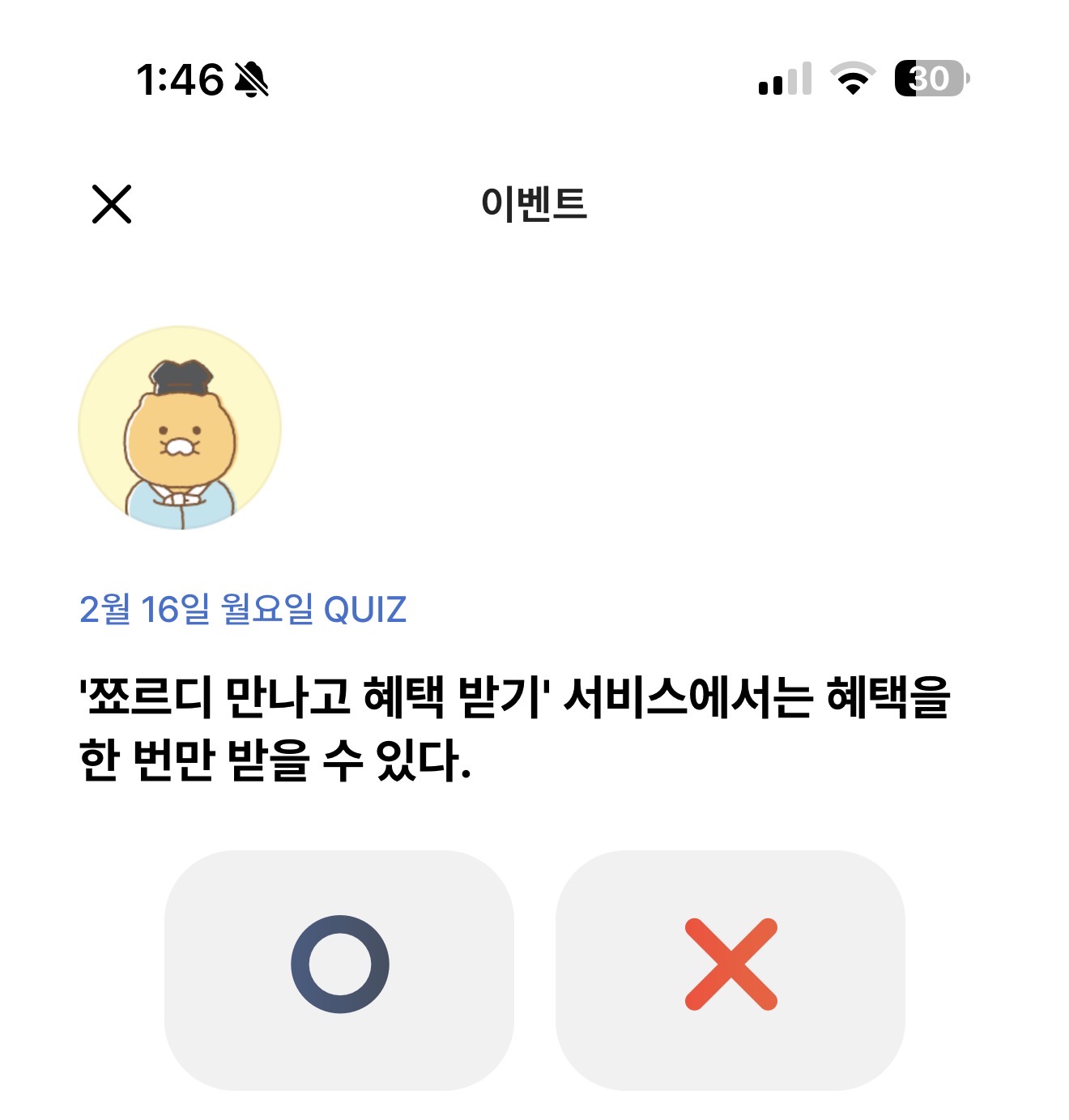 카카오뱅크 OX 퀴즈 2월 16일 정답('쬬르디 만나고 혜택 받기' 서비스에서는 혜택을 한 번만 받을 수 있다)