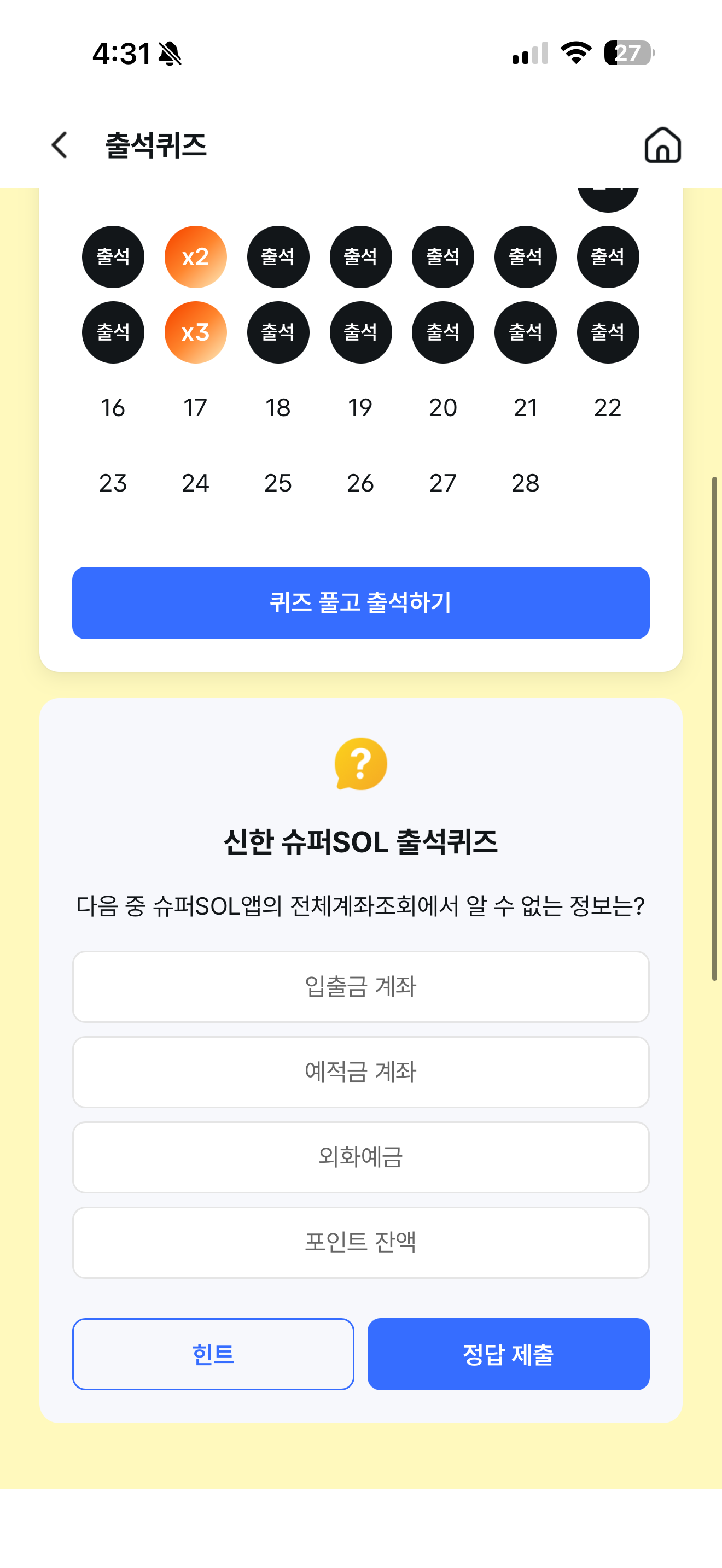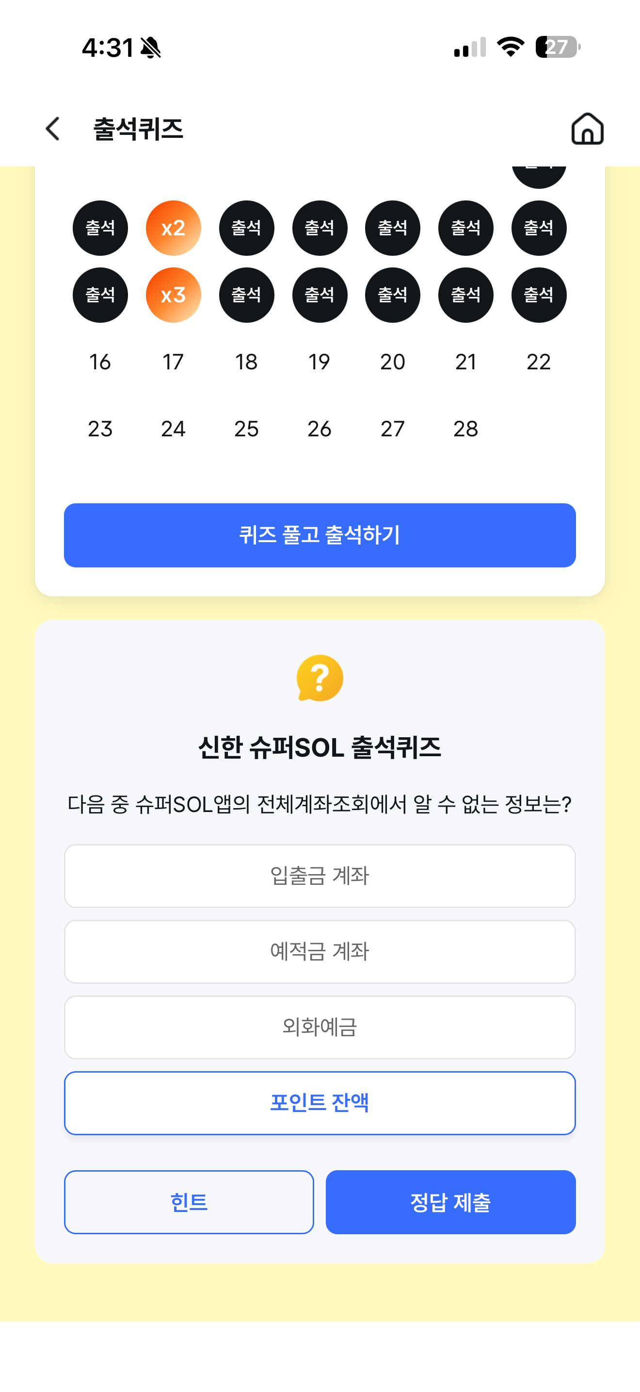 신한 슈퍼SOL 출석퀴즈 정답은 포인트 잔액 입니다