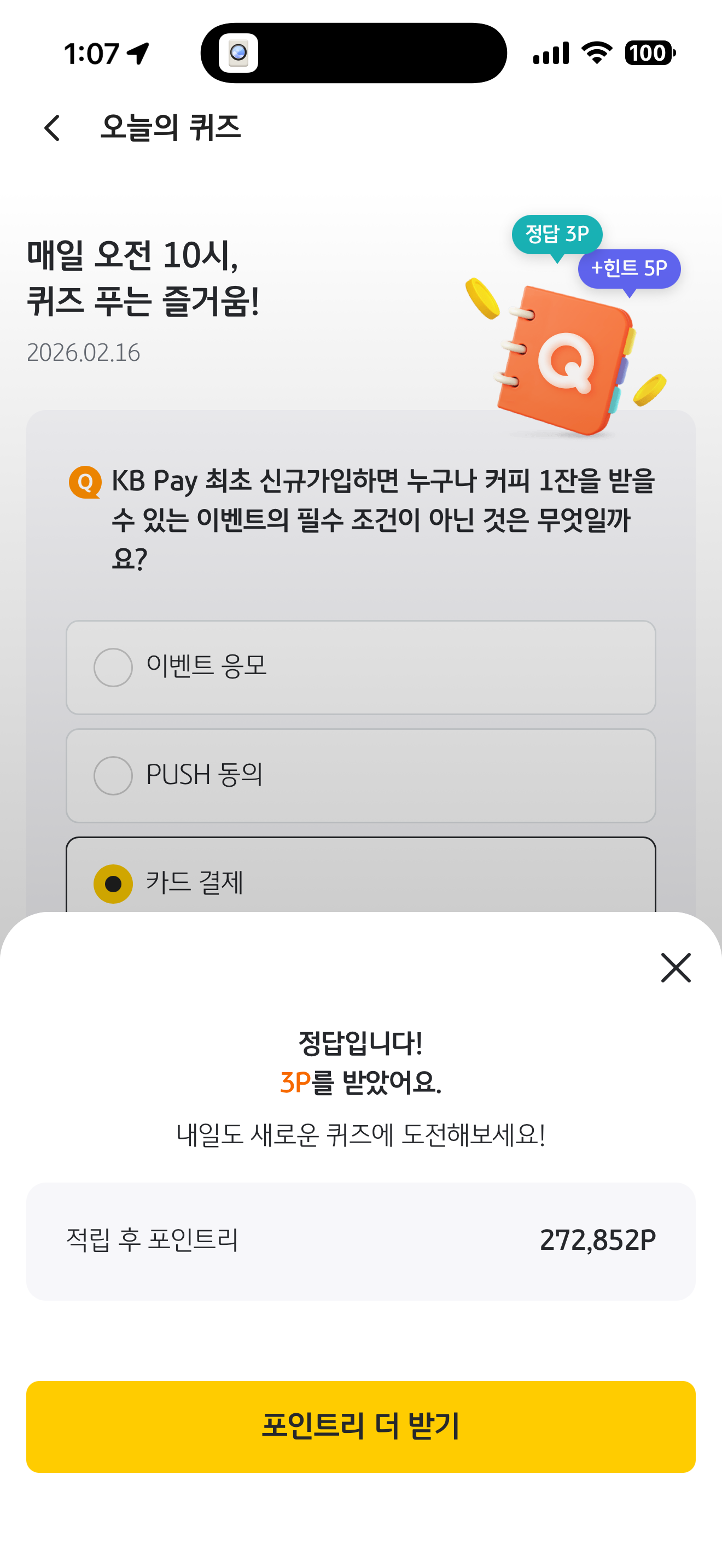 KB Pay 오늘의 퀴즈 정답은 카드 결제 입니다