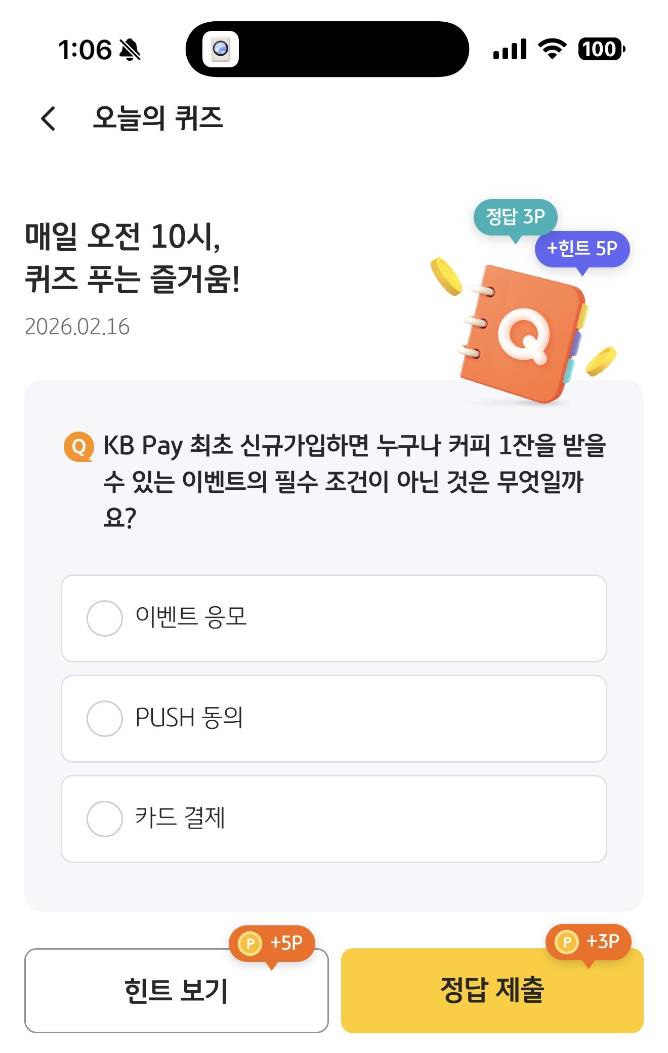 KB Pay 오늘의 퀴즈 2월 16일 문제입니다