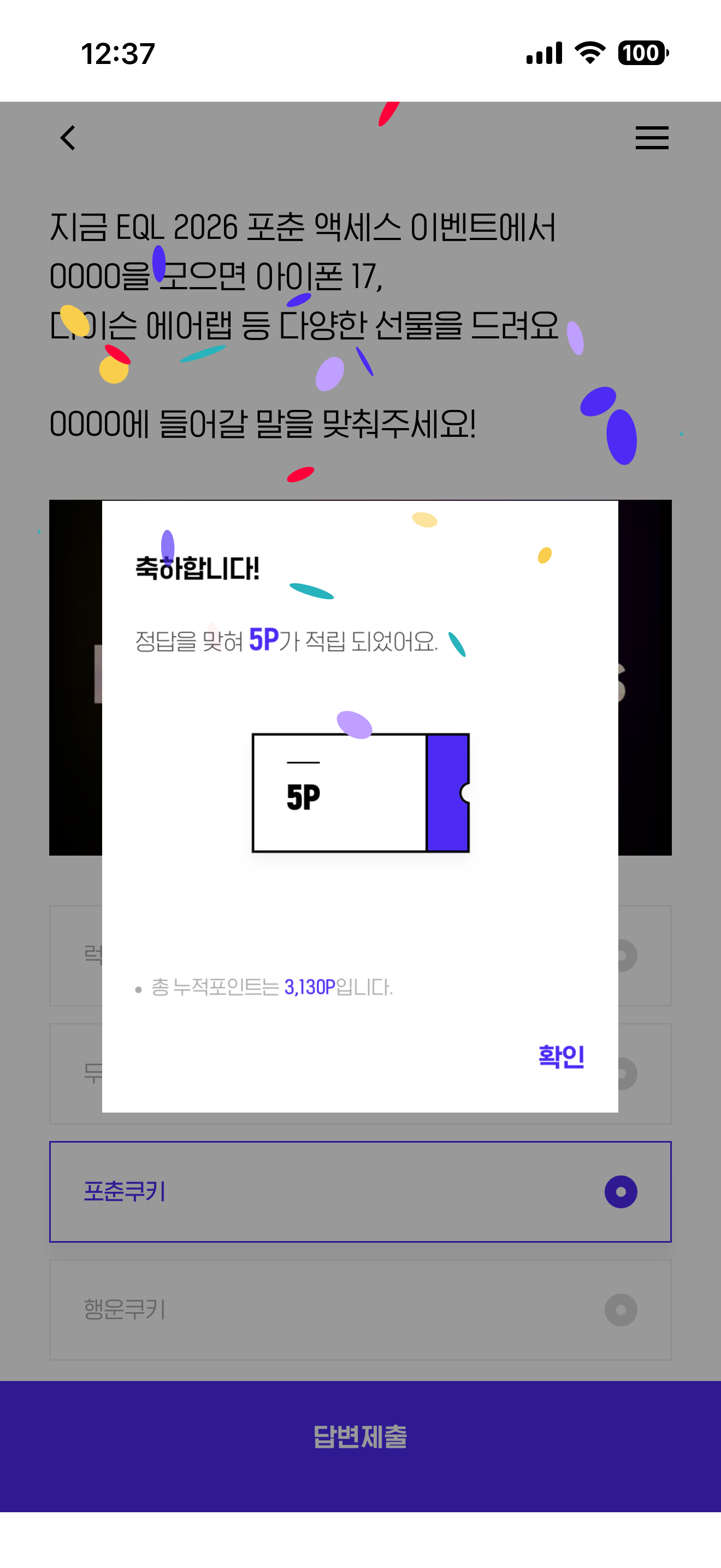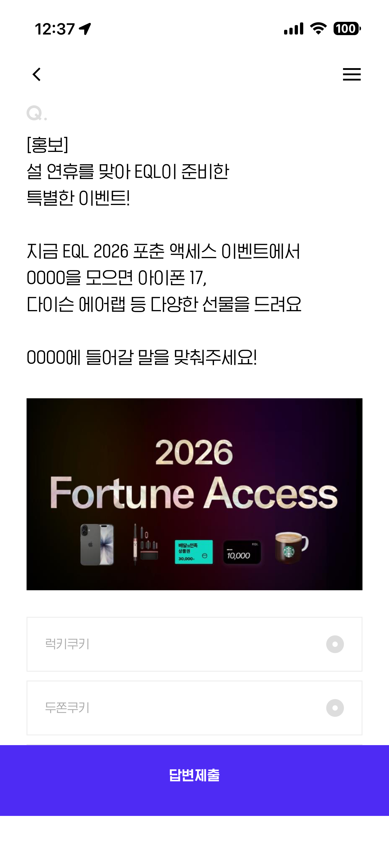 설 연휴를 맞아 EQL이 준비한 특별한 이벤트! 지금 EQL 2026 포춘 액세스 이벤트에서 0000을 모으면 아이폰17, 다이슨 에어랩 등 다양한 선물을 드려요. 0000에 들어갈 말을 맞춰주세요!  보기는 1. 럭키쿠키 2. 두쫀쿠키 3. 포춘쿠키 4. 행운쿠키 입니다