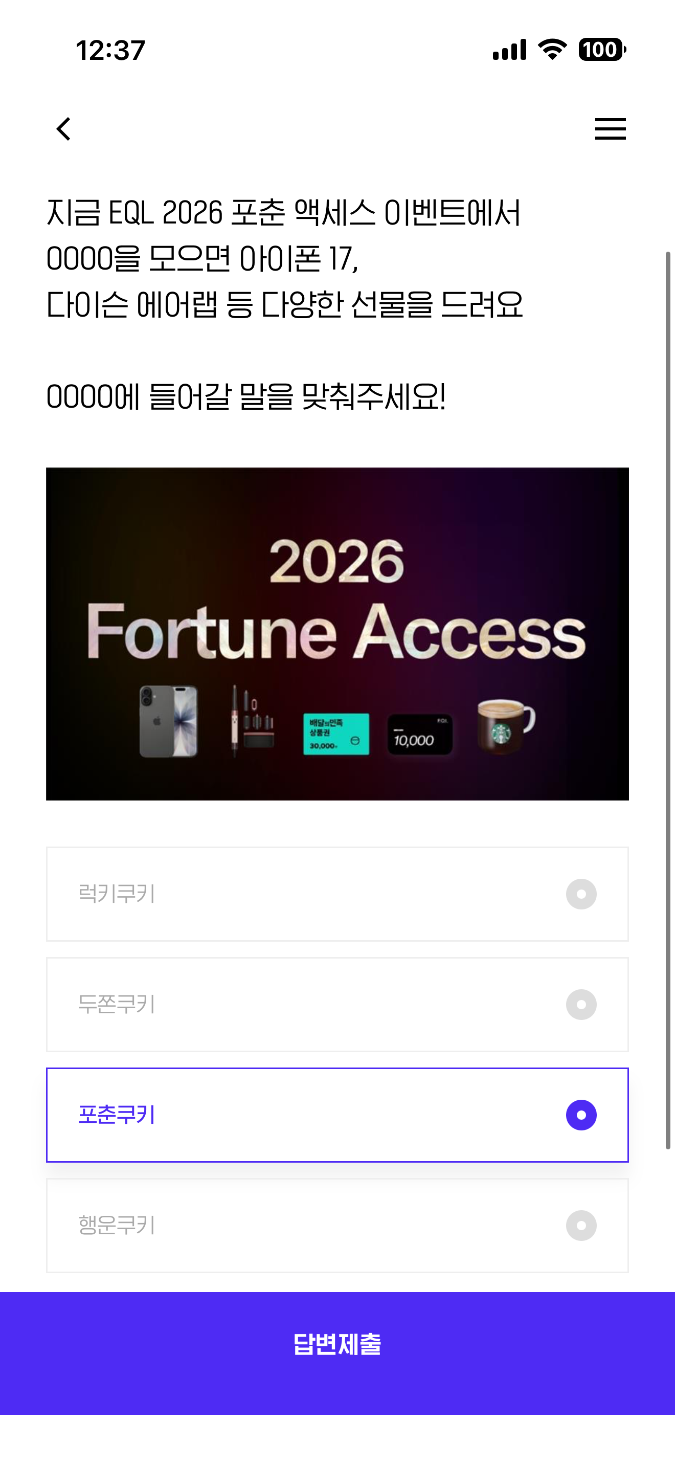 설 연휴를 맞아 EQL이 준비한 특별한 이벤트! 지금 EQL 2026 포춘 액세스 이벤트에서 0000을 모으면 아이폰17, 다이슨 에어랩 등 다양한 선물을 드려요. 0000에 들어갈 말을 맞춰주세요!  보기는 1. 럭키쿠키 2. 두쫀쿠키 3. 포춘쿠키 4. 행운쿠키 입니다