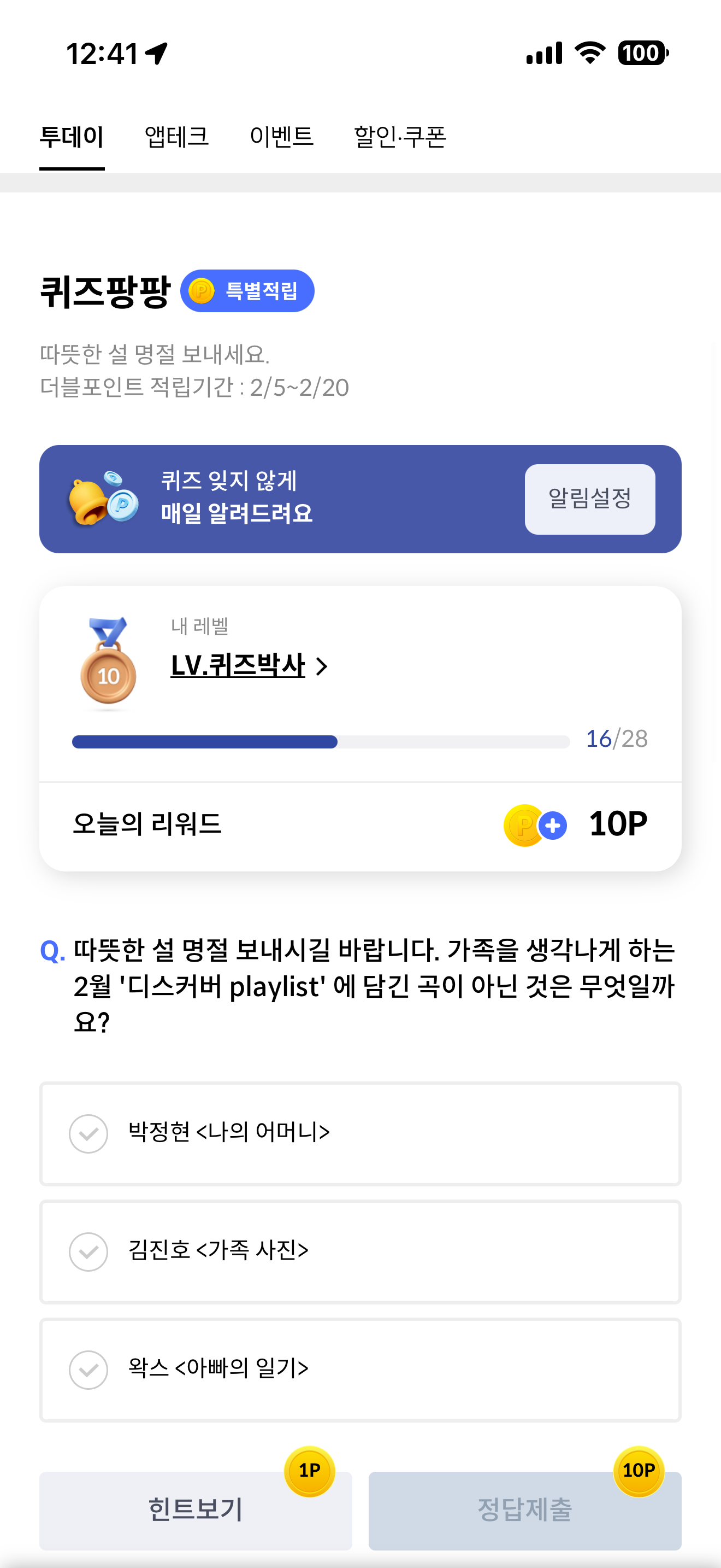 따뜻한 설 명절 보내시길 바랍니다. 가족을 생각나는 하는 2월 '디스커버 playlist' 에 담긴 곡이 아닌 것은 무엇일까요? 보기는 1. 박정현 <나의 어머니> 2. 김진호 <가족 사진> 3. 왁스 <아빠의 일기> 입니다