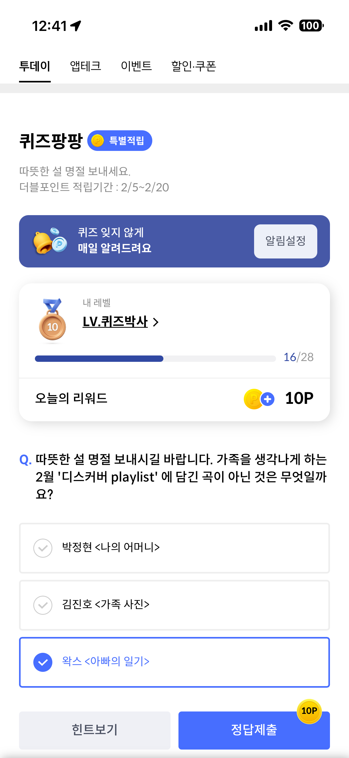 따뜻한 설 명절 보내시길 바랍니다. 가족을 생각나는 하는 2월 '디스커버 playlist' 에 담긴 곡이 아닌 것은 무엇일까요? 보기는 1. 박정현 <나의 어머니> 2. 김진호 <가족 사진> 3. 왁스 <아빠의 일기> 입니다