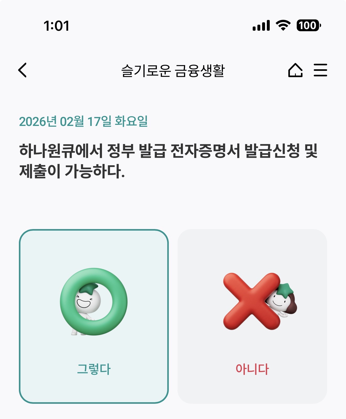 하나원큐에서 정부 발급 전자증명서 발급신청 및 제출이 가능하다 O, X 퀴즈인데요. 하나원큐에서는 정부 발급 전자증명서 발급이 가능할까요? 그리고 제출도 가능할까요? 잘 참고해서 활용해 보세요