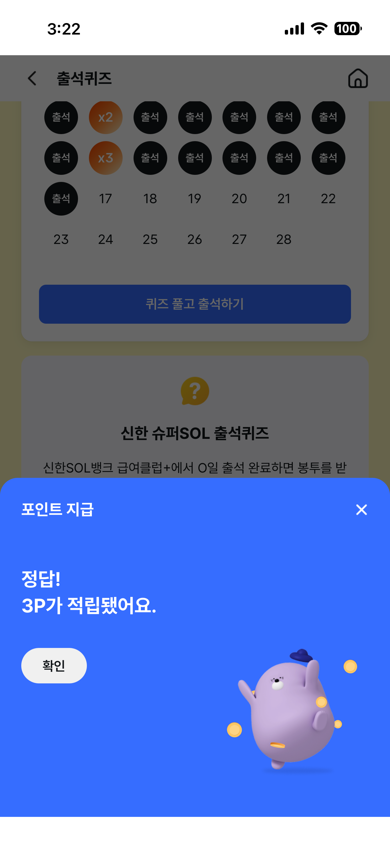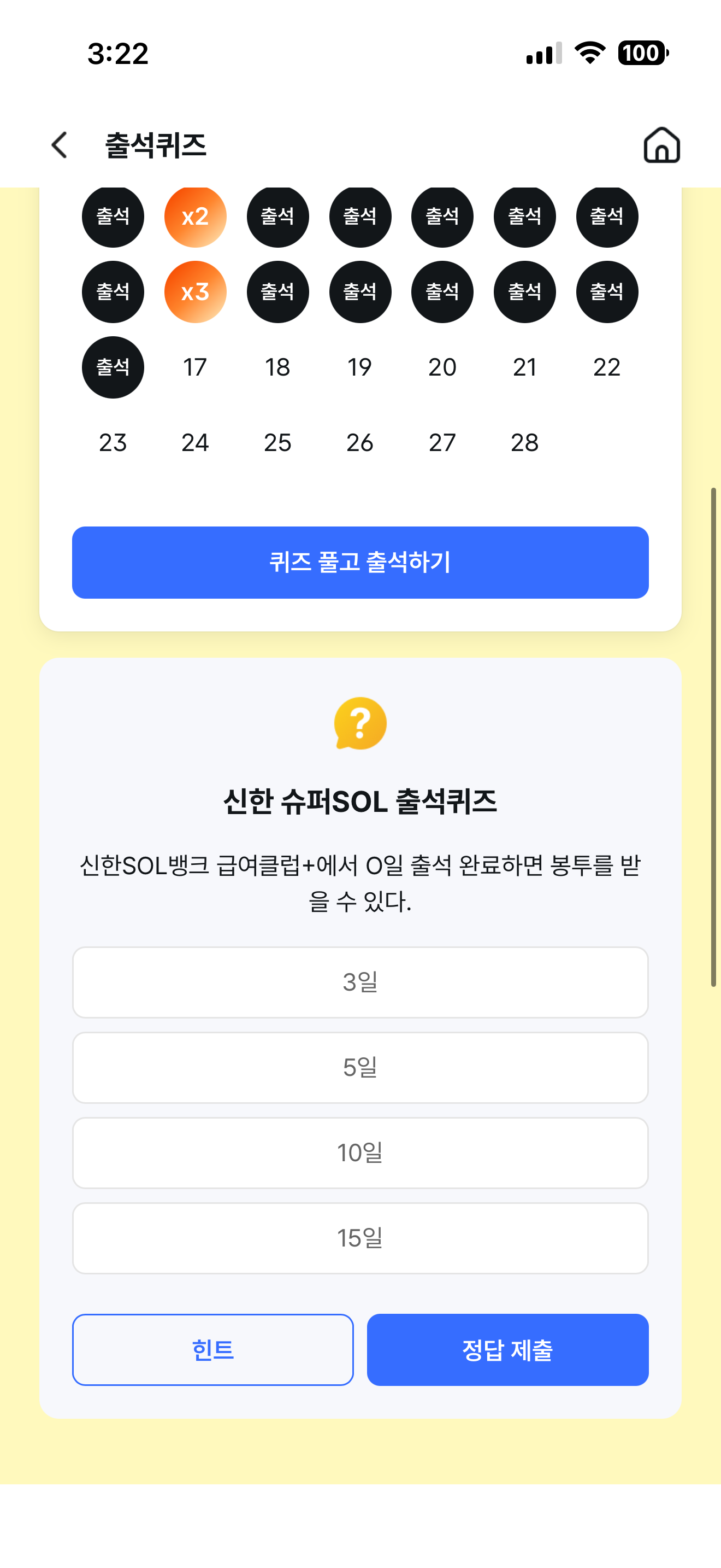 신한SOL뱅크 급여클럽+에서 O일 출석 완료하면 봉투를 받을 수 있다 보기는 1. 3일 2. 5일 3. 10일 4. 15일 입니다. 급여클럽+에서 출석만으로 혜택을 볼 수 있으니 잘 참고해서 활용하세요