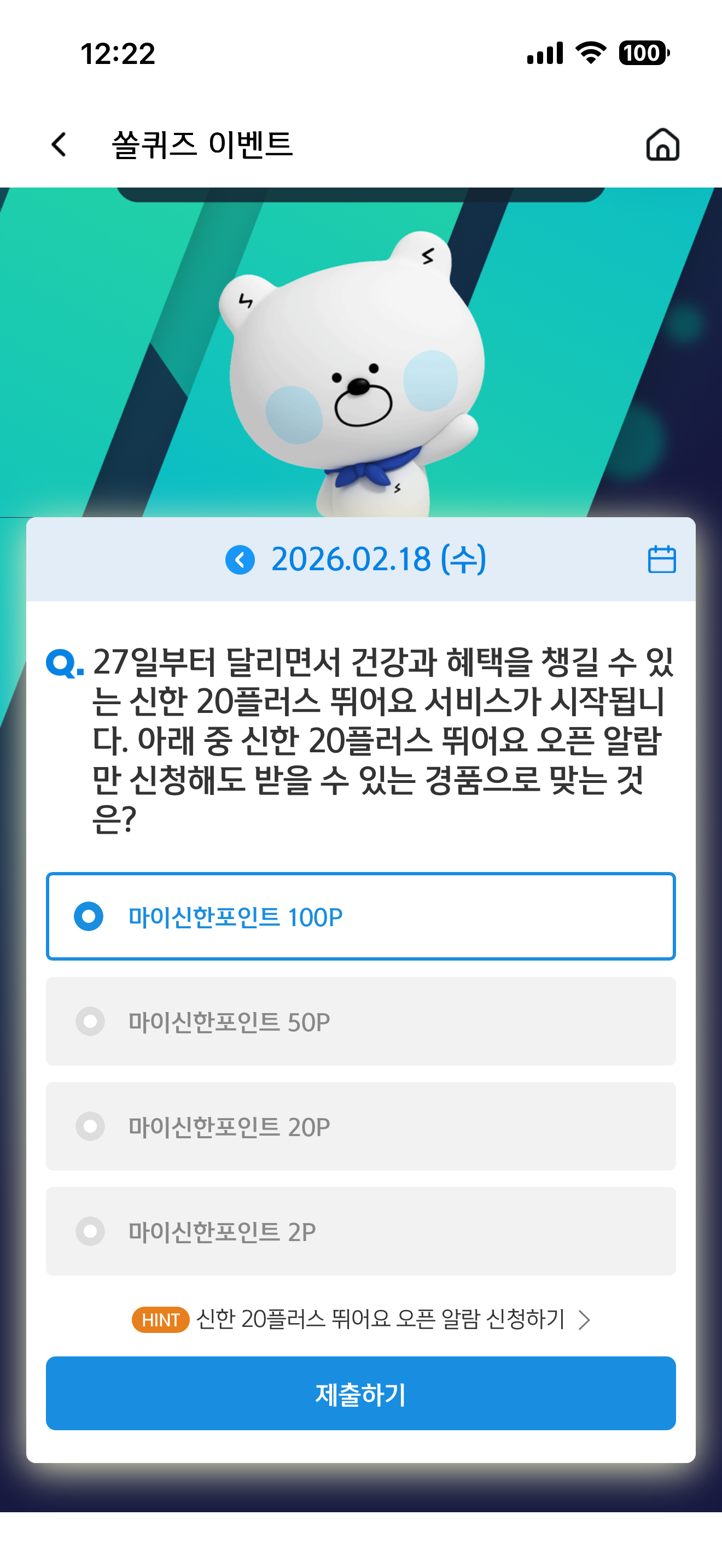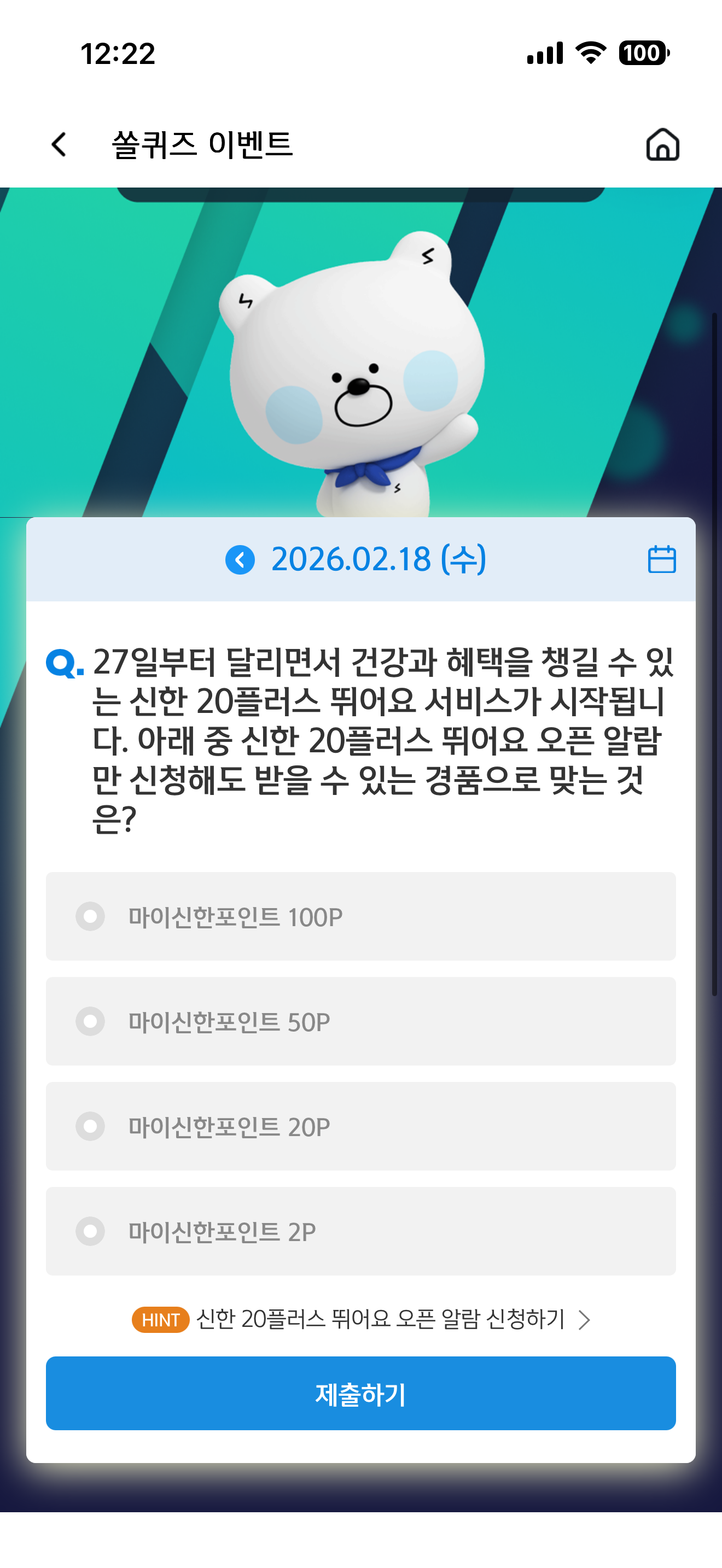 27일부터 달리면서 건강과 혜택을 챙길 수 있는 신한 20플러스 뛰어요 서비스가 시작됩니다. 아래 중 신한 20플러스 뛰어요 오픈 알람만 신청해도 받을 수 있는 경품으로 맞는 것은? 보기는 1. 마이신한포인트 100P 2. 마이신한포인트 50P 3. 마이신한포인트 20P 4. 마이신한포인트 2P 입니다