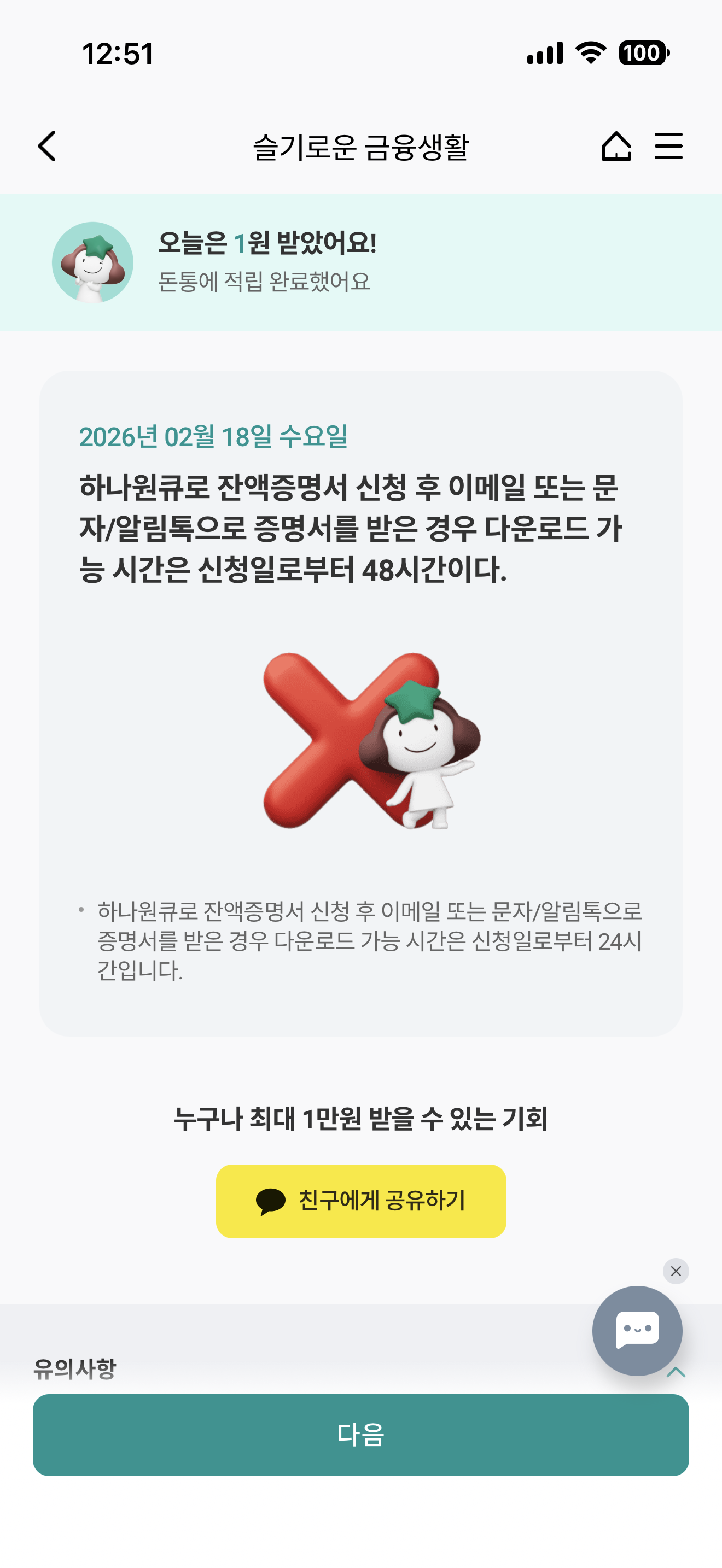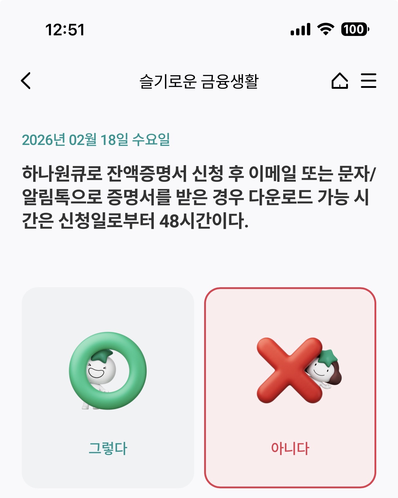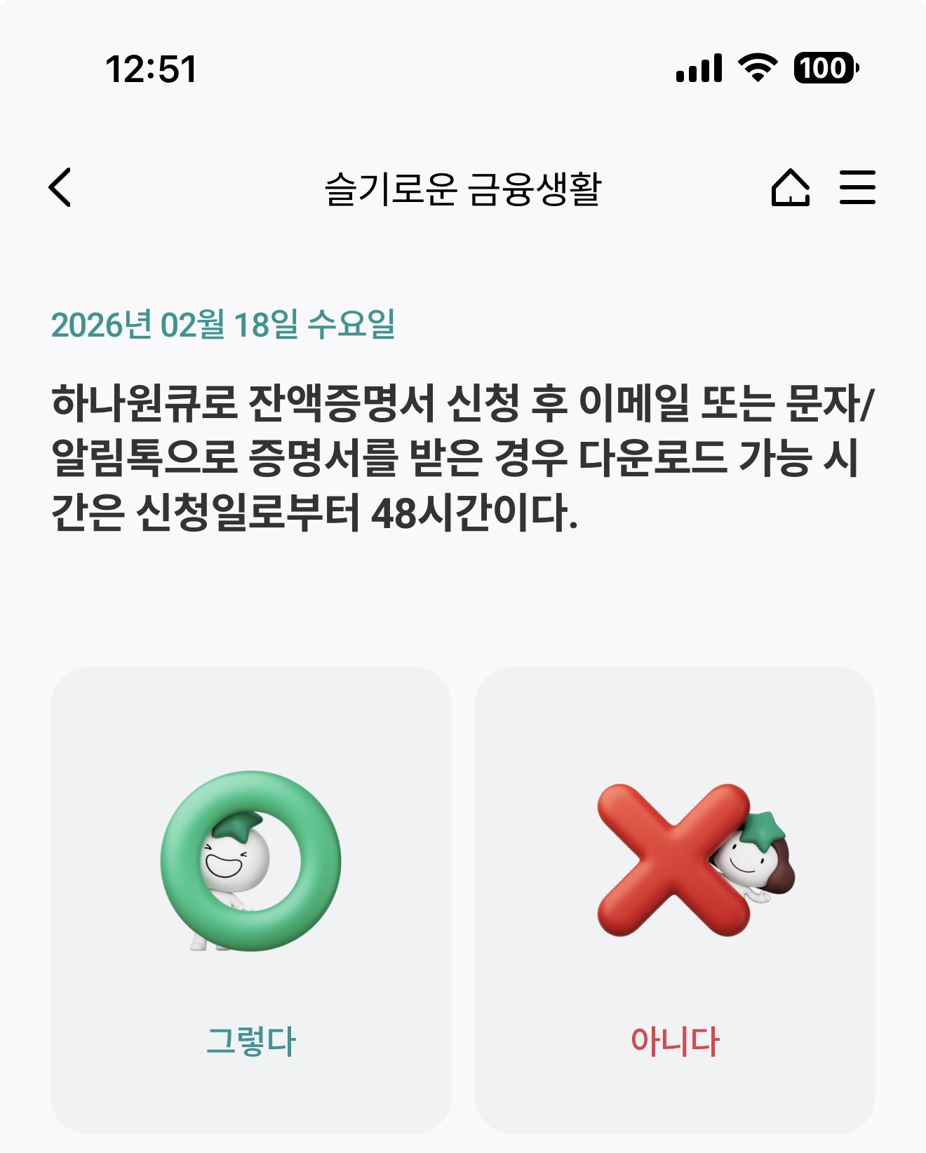 하나원큐로 잔액증명서 신청 후 이메일 또는 문자/알림톡으로 증명서를 받은 경우 다운로드 가능 시간은 신청일로부터 48시간이다. 그렇다 아니다 선택하면 되는데요.