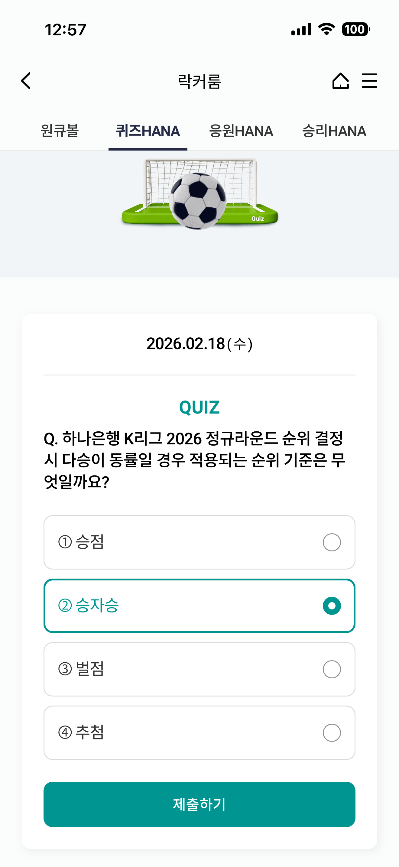 하나원큐 축구 play 퀴즈 HANA 2월 18일 정답(하나은행 K리그 2026 정규라운드 순위 결정시 다승이 동률일 경우 적용되는 순위 기준은 무엇일까요?)