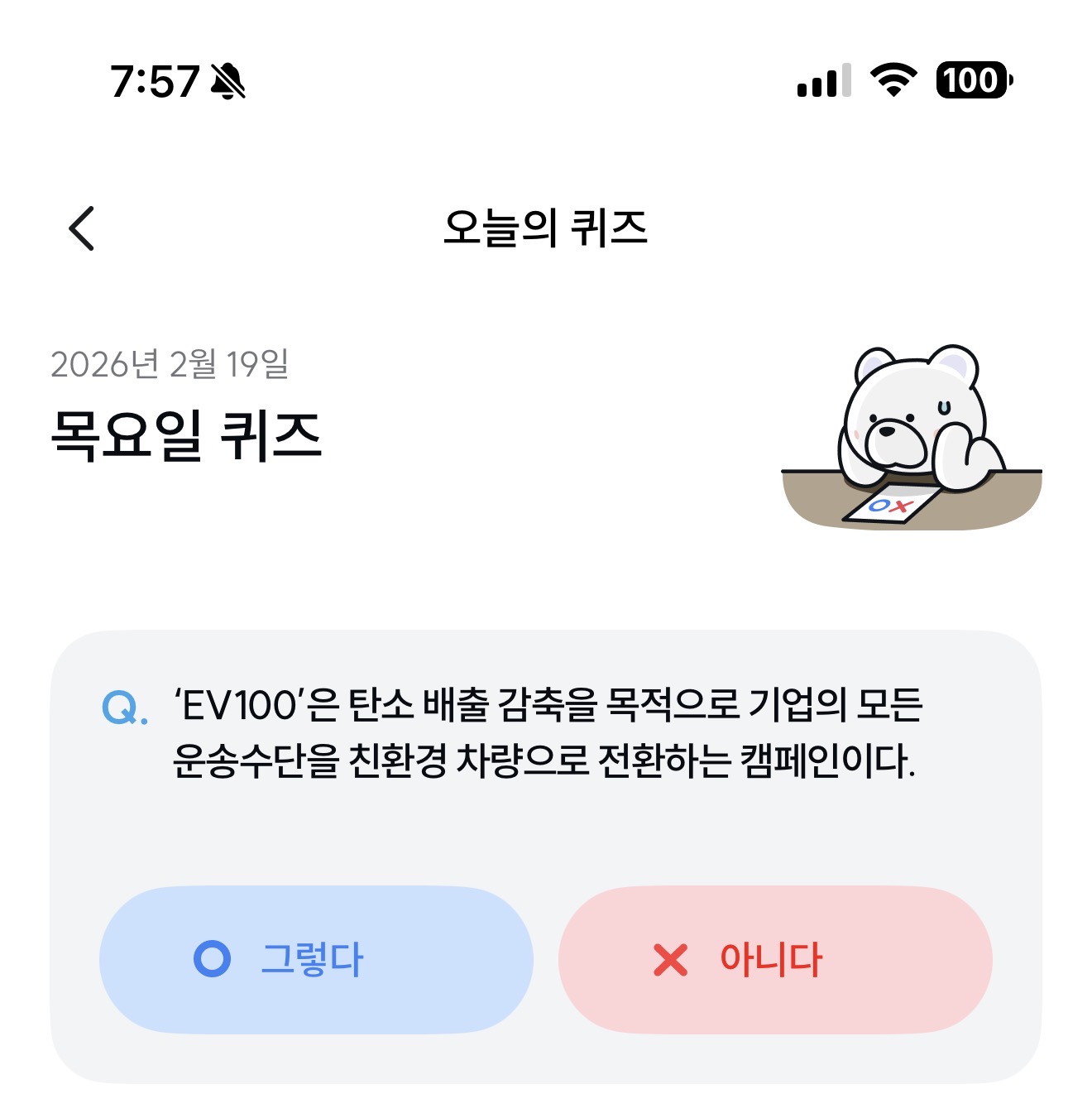 'EV100'은 탄소 배출 감축을 목적으로 기업의 모든 운송수단을 친환경 차량으로 전환하는 캠페인이다. 그렇다 아니다 선택하면 되는데요. EV100은 뭘까요? 요즘 친환경을 위해 다양한 용어들이 만들어지고 있는데요. 잘 참고해 두세요