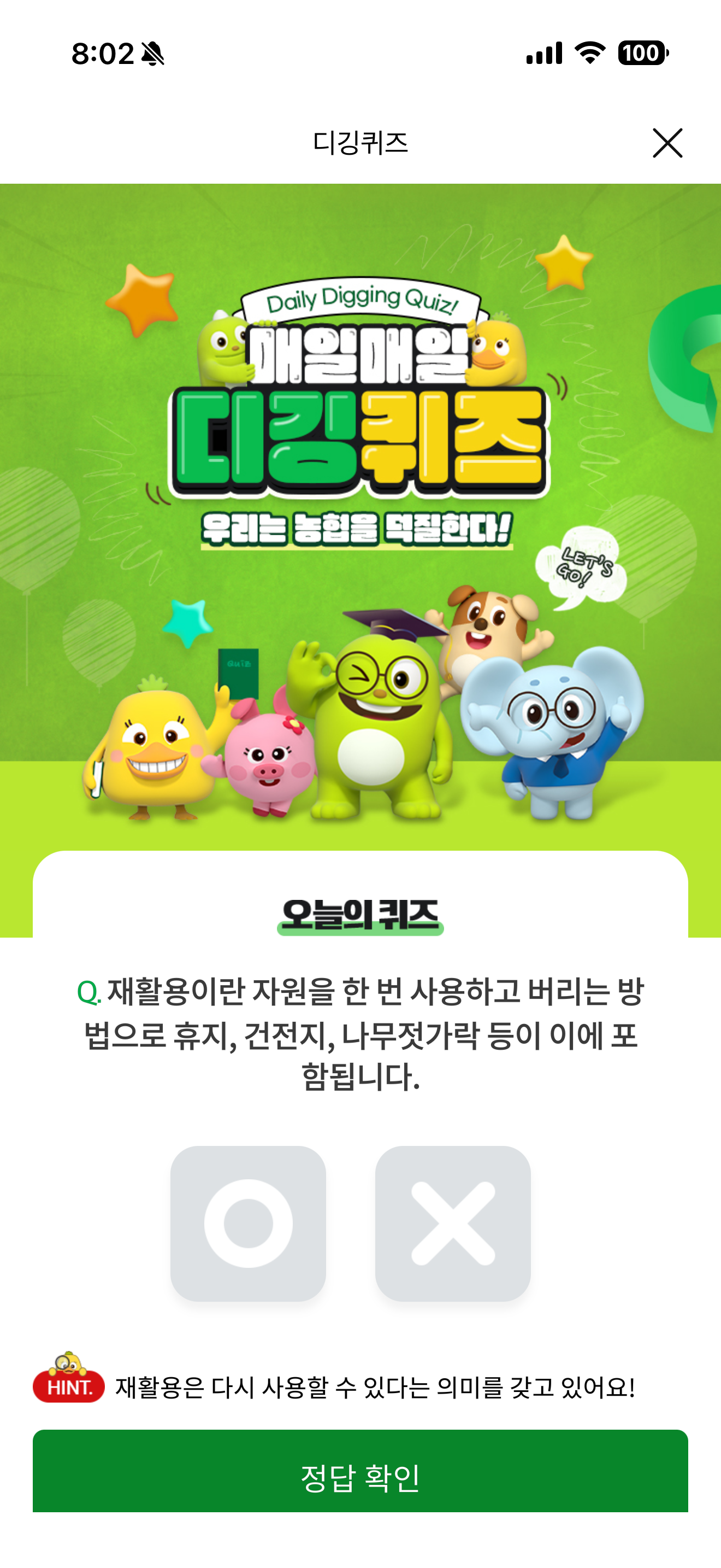 재활용이란 자원을 한 번 사용하고 버리는 방법으로 휴지, 건전지, 나무젓가락 등이 이에 포함됩니다. O, X 퀴즈인데요. 재활용이 한 번 사용하고 버리는 걸까요? 재활용은 계속 활용되는 것을 의미하죠. 잘 참고해 두세요