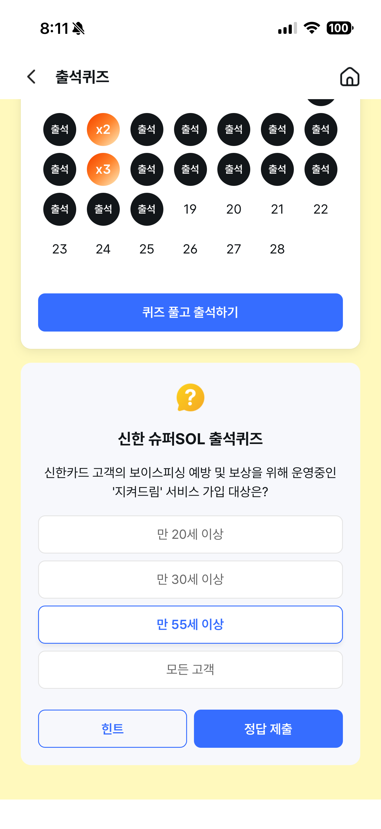 신한 슈퍼SOL 출석퀴즈 정답은 만 55세 이상 입니다