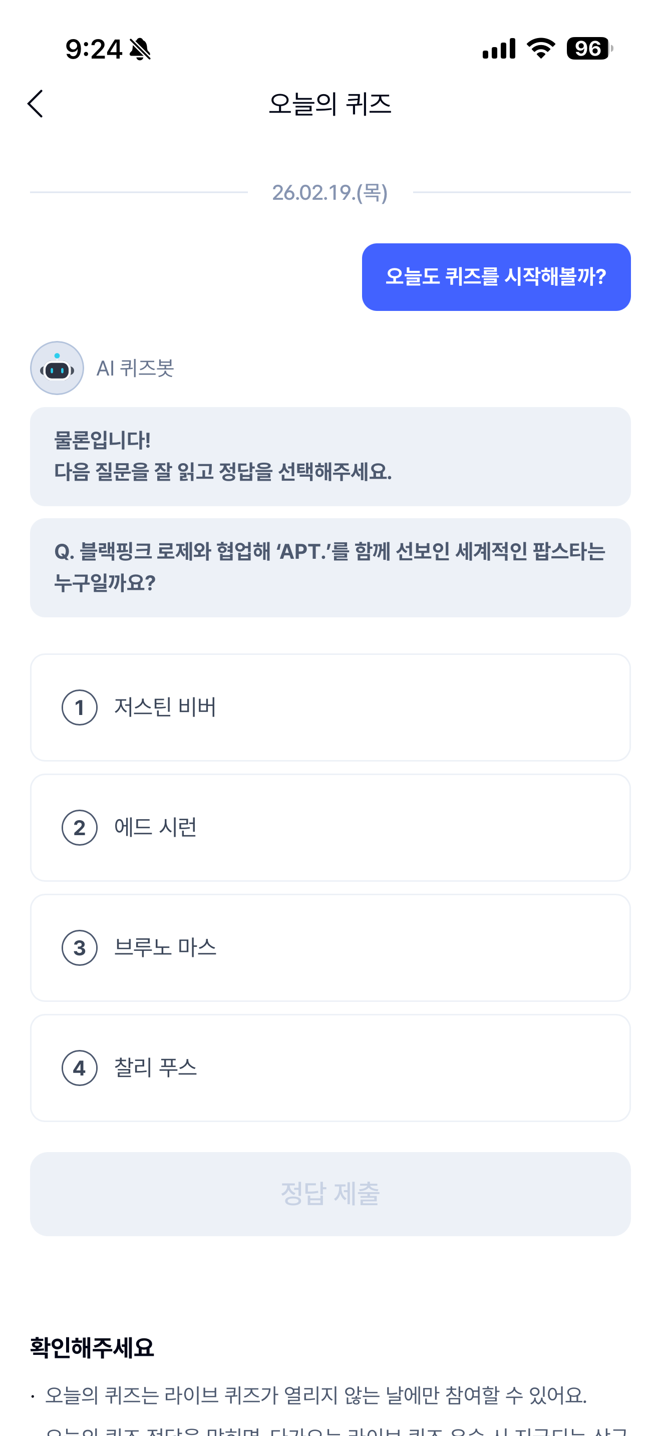 케이뱅크 AI 퀴즈 챌린지 정답은 브루노 마스 입니다