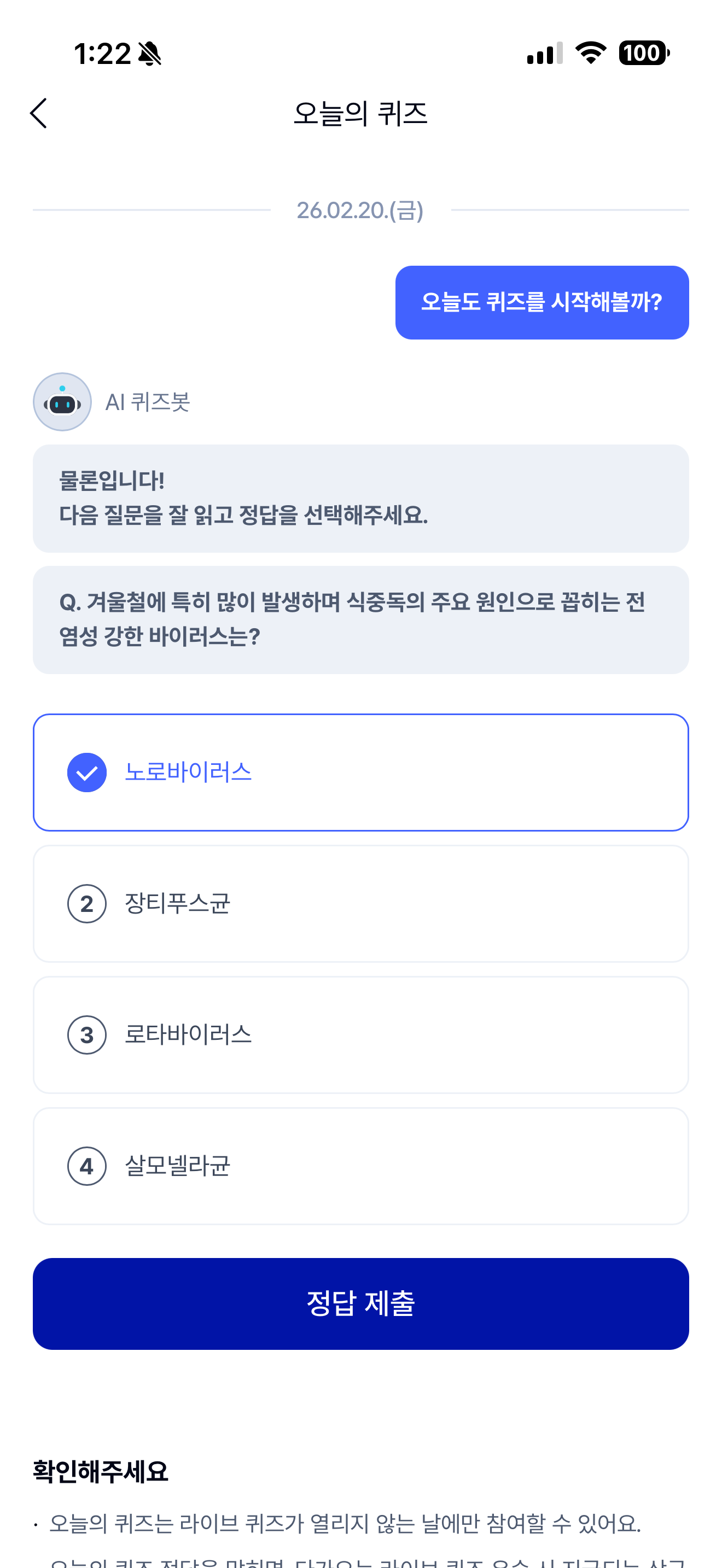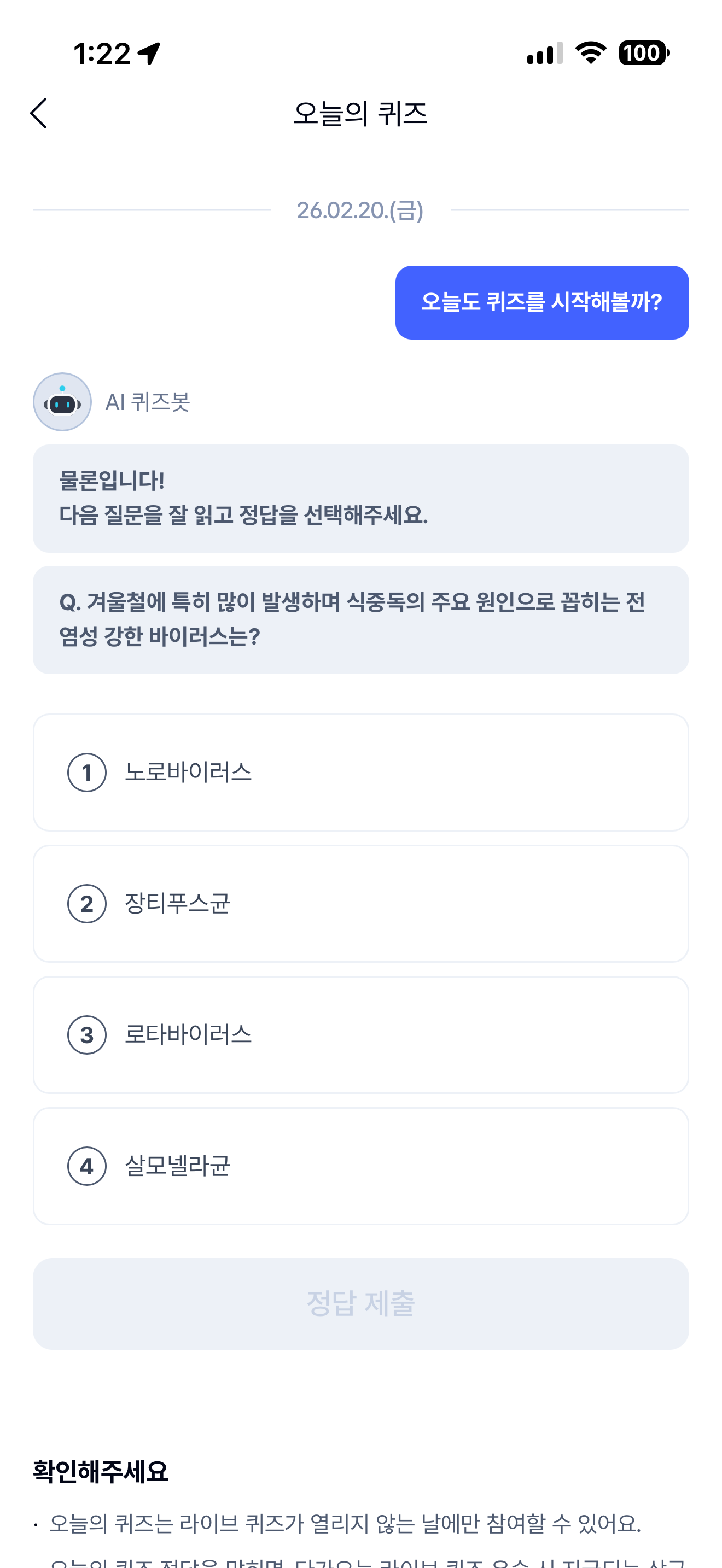 케이뱅크 AI 퀴즈 정답은 노로바이러스 입니다