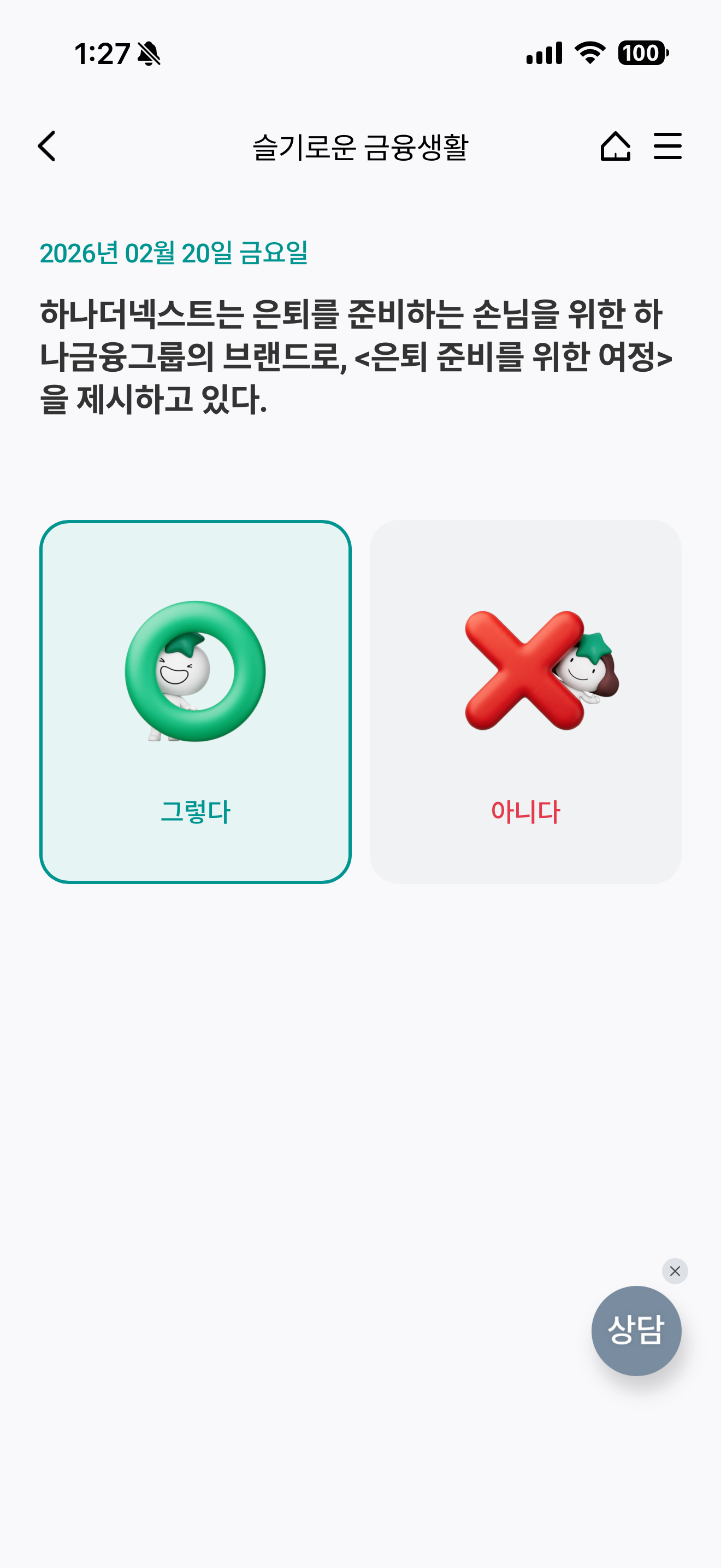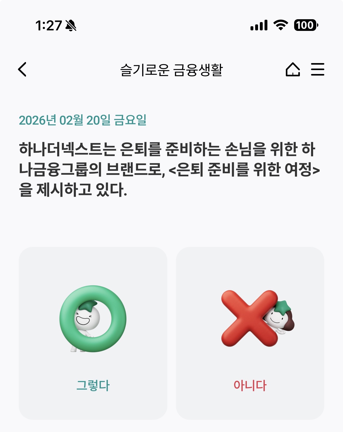 하나더넥스트는 은퇴를 준비하는 손님을 위한 하나금융그룹의 브랜드로, <은퇴 준비를 위한 여정>을 제시하고 있다. 그렇다 아니다 선택하면 되는데요.