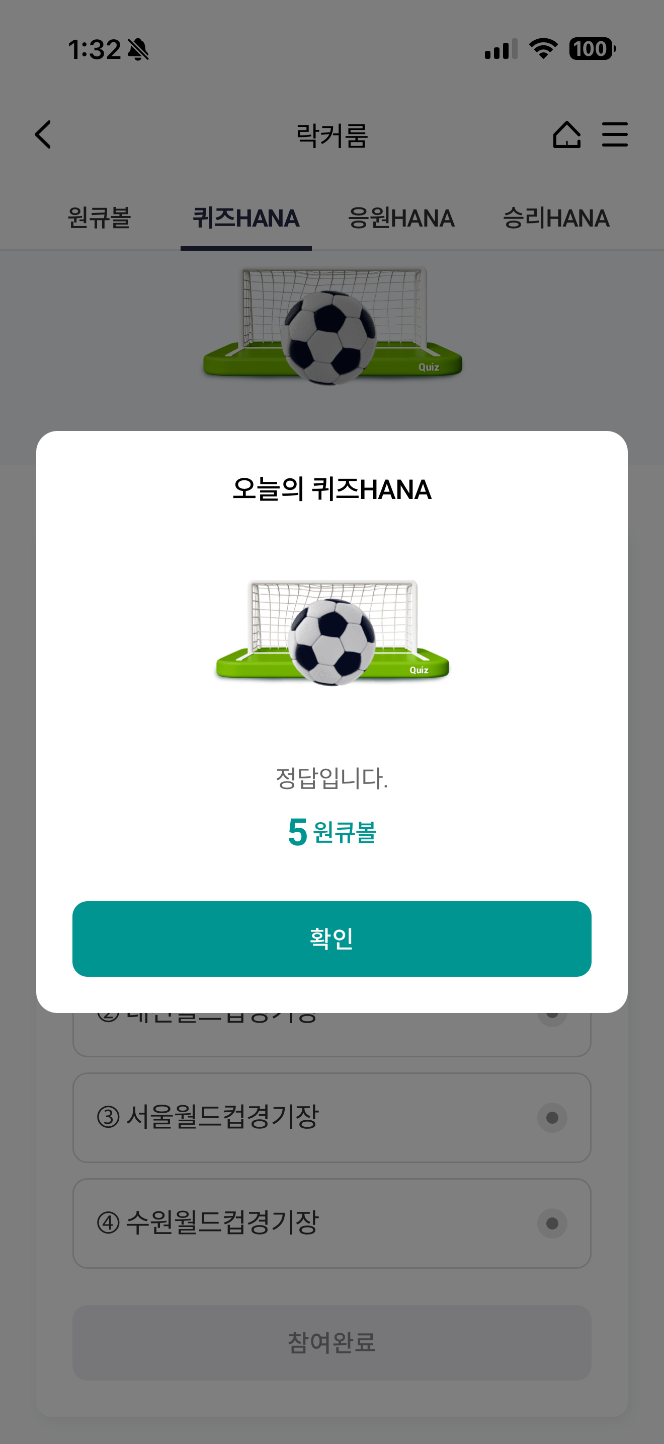 하나원큐 축구 play 퀴즈 HANA 정답은 전주월드컵경기장 입니다