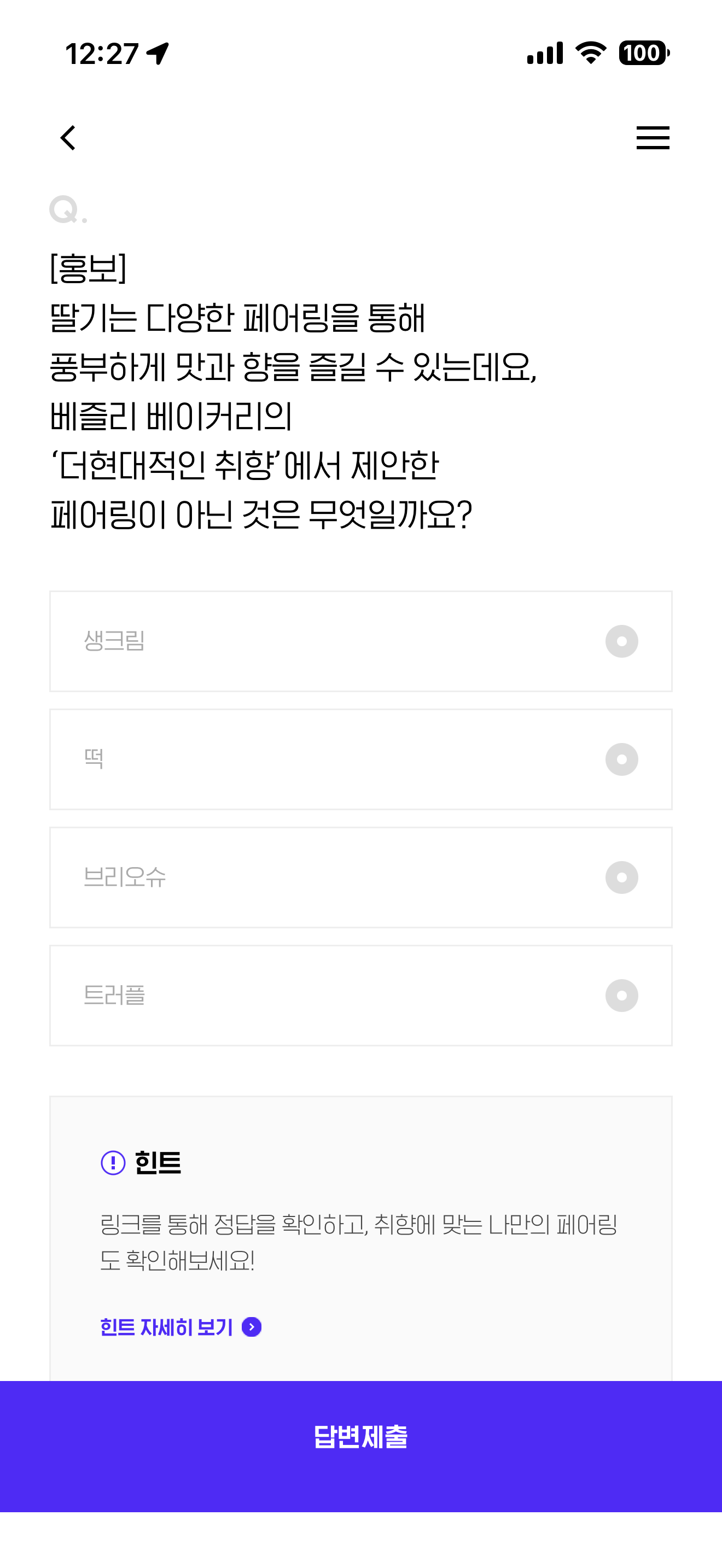 H포인트 퀴즈 2월 22일 정답(딸기는 다양한 페어링을 통해 풍부하게 맛과 향을 즐길 수 있는데요, 베즐리 베이커리의 '더현대적인 취향' 에서 제안한 페어링이 아닌 것은 무엇일까요?)